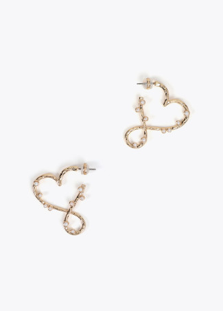 Orecchini grandi a forma di cuore con texture dorata. Presentano logo centrale in metallo e chiusura a vite. Un accessorio sofisticato per occasioni speciali.
