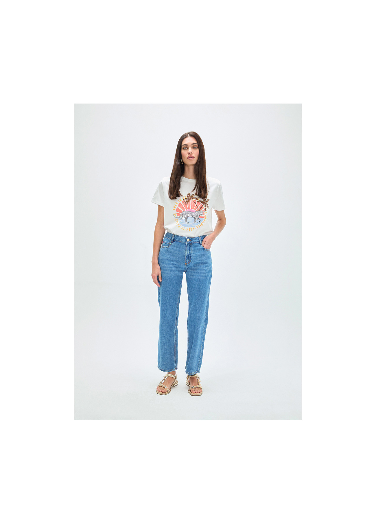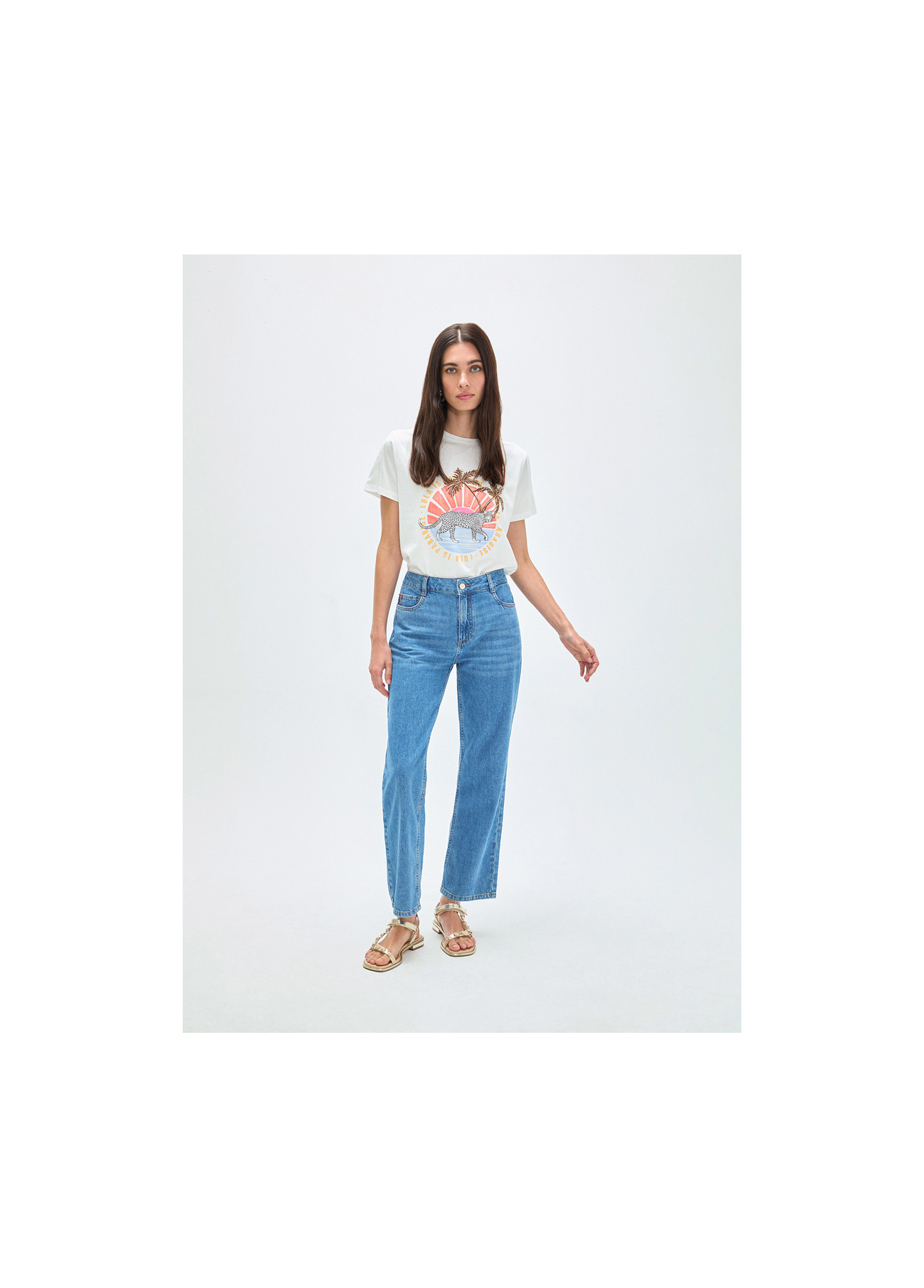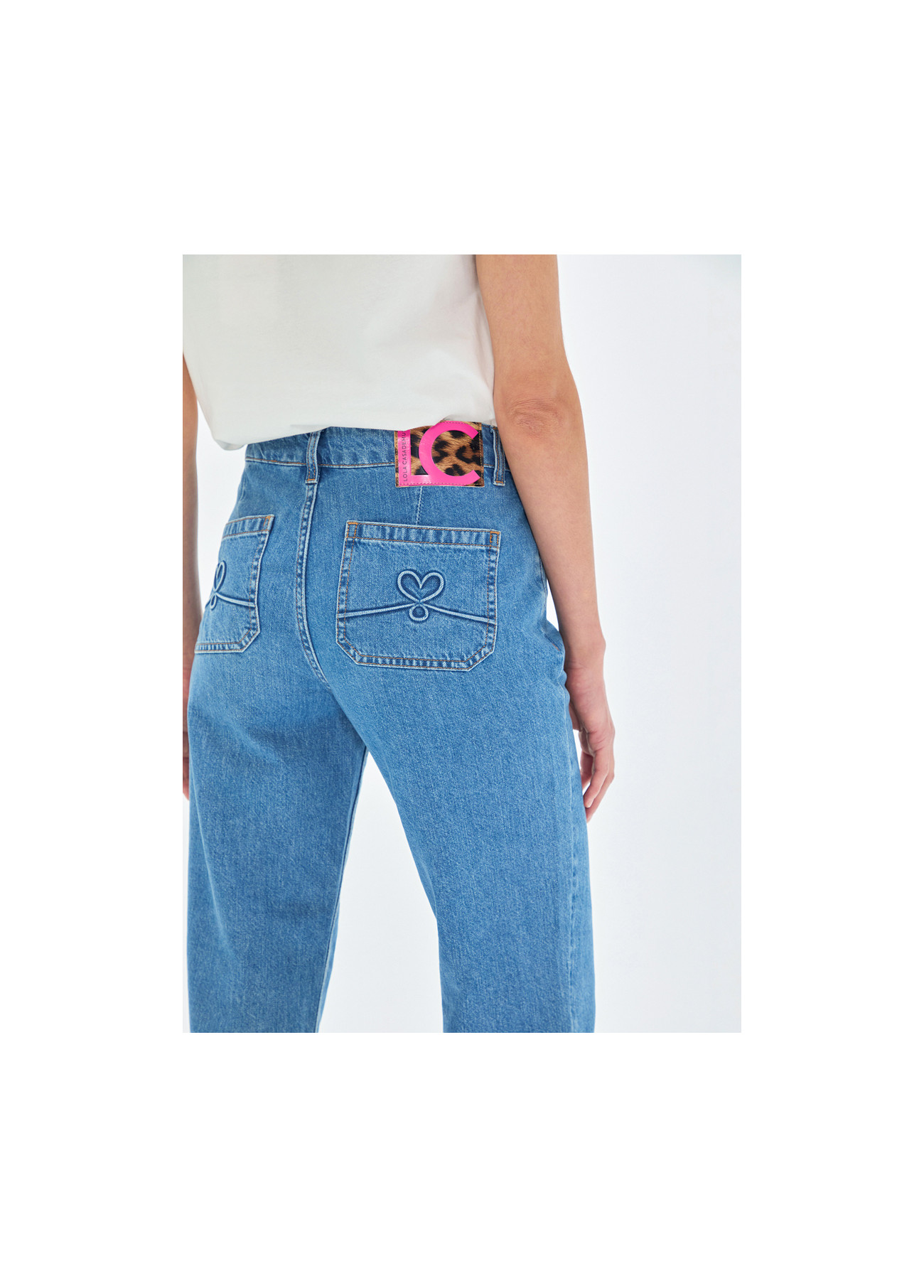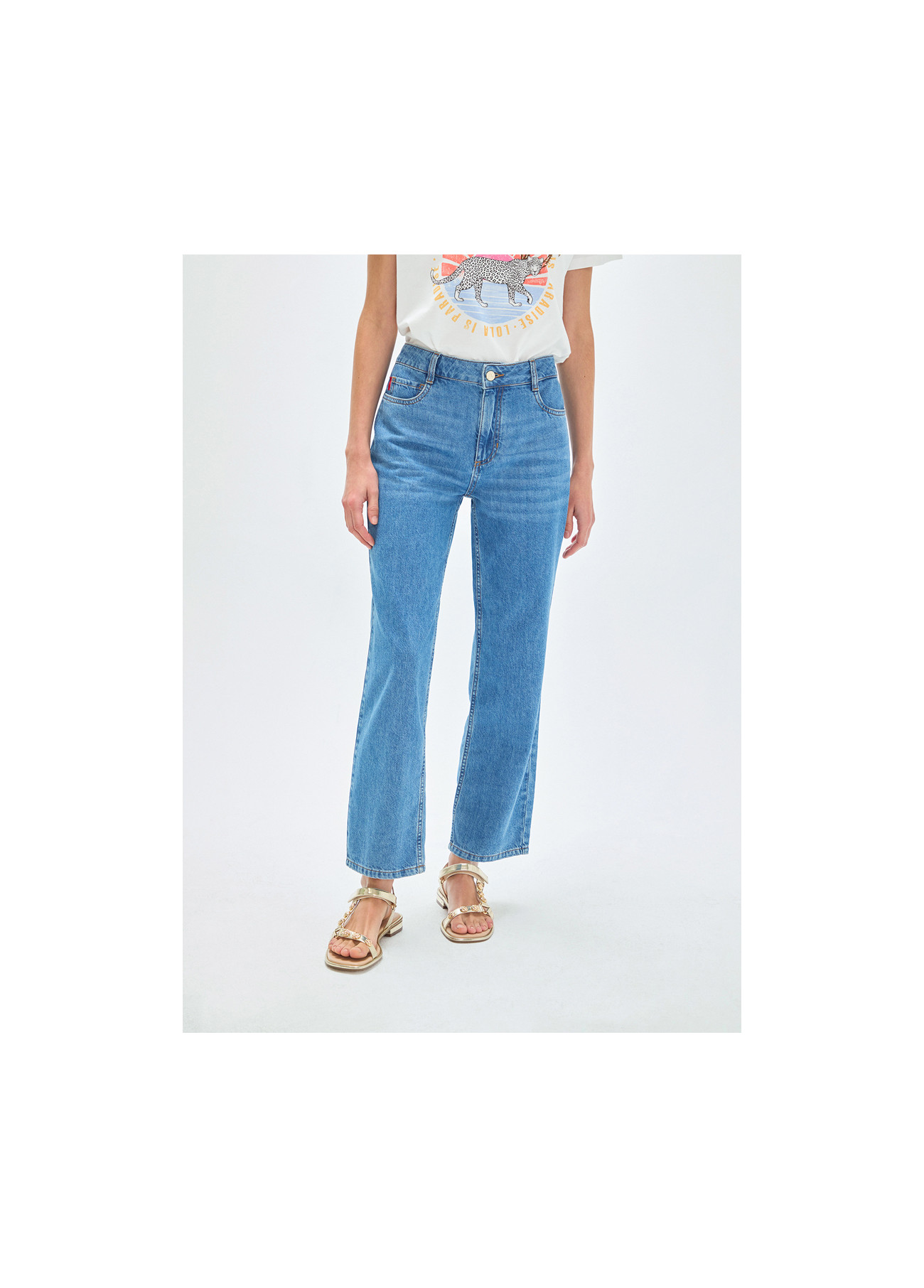 Jeans dal taglio dritto in tono blu medio. Realizzati in cotone di alta qualità per il massimo comfort. Design classico a cinque tasche con dettagli sottili sul retro. Chiusura con bottone e zip.