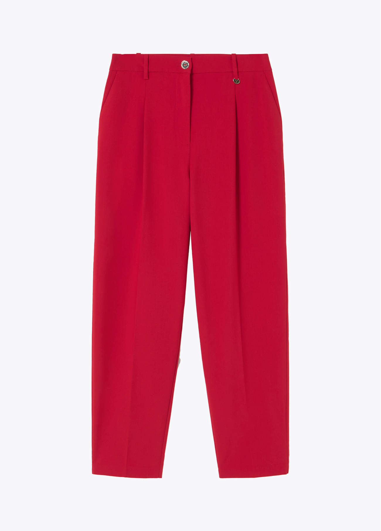 Pantaloni rossi con pieghe e taglio alla caviglia. Tessuto di alta qualità e chiusura laterale con cerniera. Progettati per offrire eleganza e comfort in ogni occasione.
