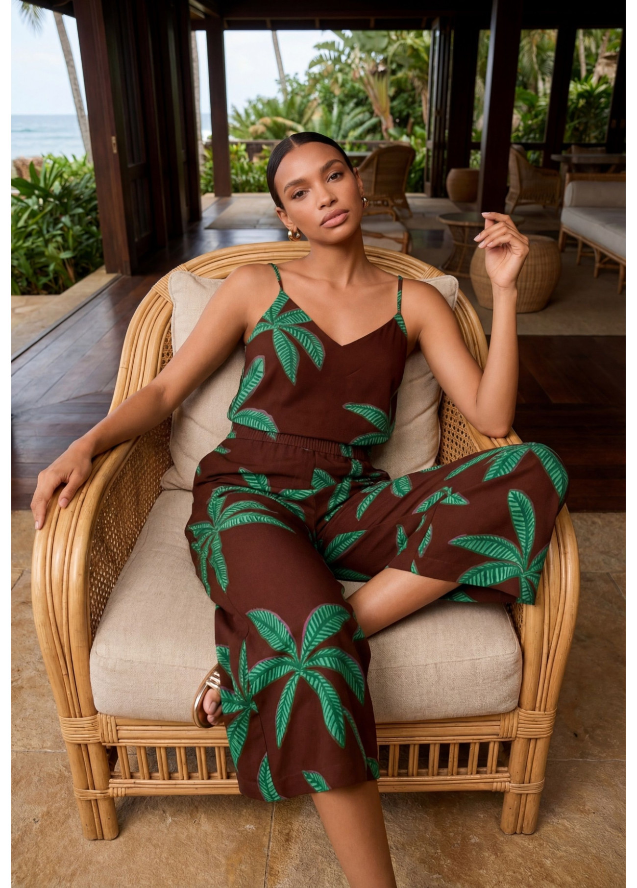 Pantaloni larghi in tessuto leggero con sfondo marrone e vibrante stampa verde di palme. Vita elastica per maggiore comodità. Perfetti per un look estivo rilassato.