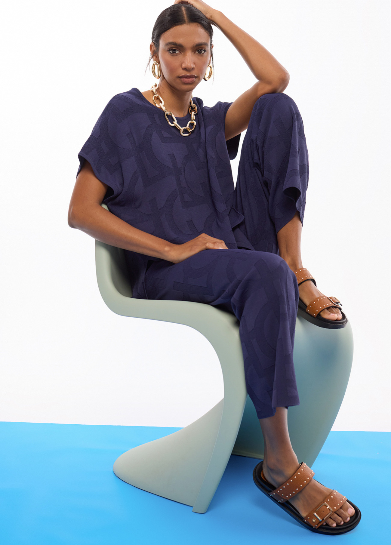 Pantaloni tricot blu con design jacquard. Realizzati in tessuto morbido ed elastico per una vestibilità confortevole e stilosa. Vita elastica e taglio dritto. Ideali per un look casual con un tocco di eleganza.