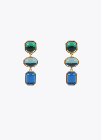Collana con catena dorata a maglie grandi e perline pendenti blu e verdi. Chiusura regolabile. Senza nichel e ipoallergenica.