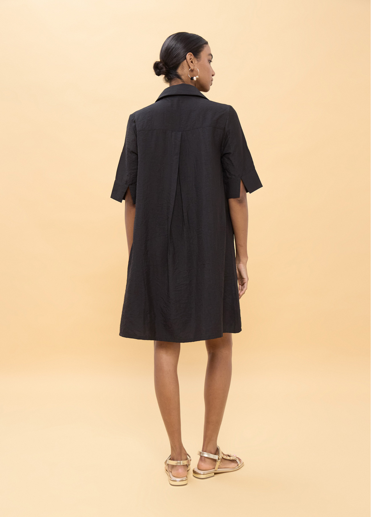 Abito corto con taglio dritto e dettagli di palme ricamate tono su tono. Maniche corte e colletto a revers per un look rilassato. Design leggero e comodo, perfetto per le giornate di sole. Tasche laterali per maggiore funzionalità.