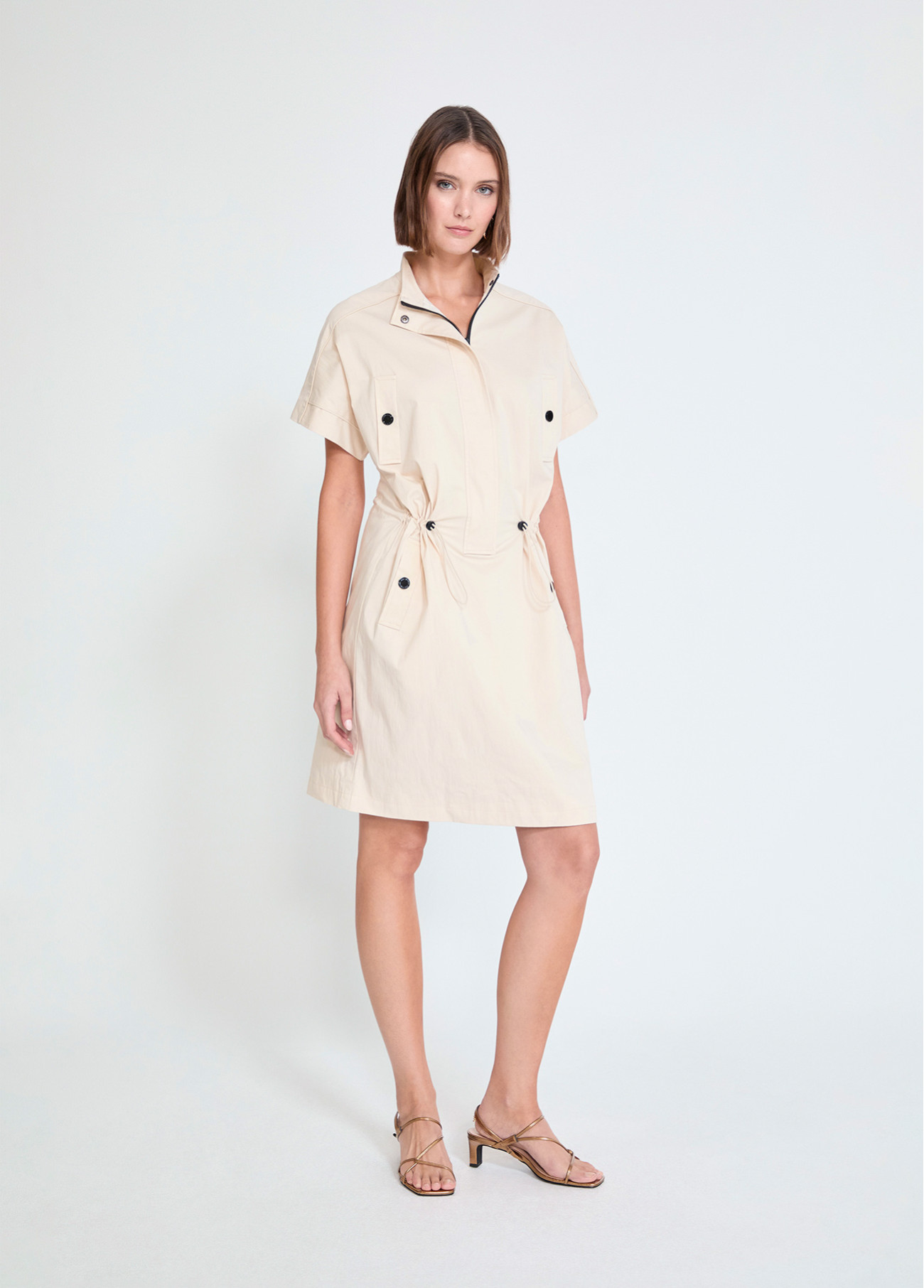 Abito dritto in stile anni '80 con collo alto e maniche corte. Realizzato in tessuto leggero, con tasche frontali e cintura regolabile. Perfetto per un look casual chic, comodo e versatile.