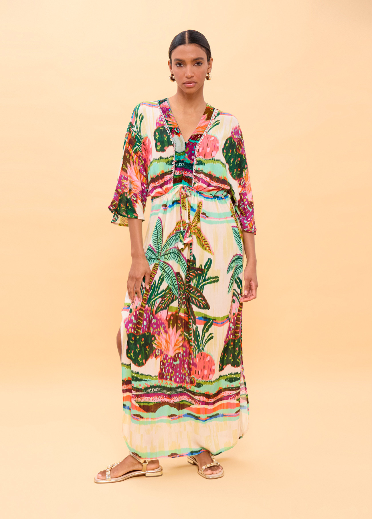 Abito lungo multicolore con maniche ampie e stampa palme. Realizzato in tessuto leggero, presenta una vestibilità rilassata con cintura in vita. Ideale per un look estivo fresco. Progettato con scollo a V e dettaglio spacco laterale.