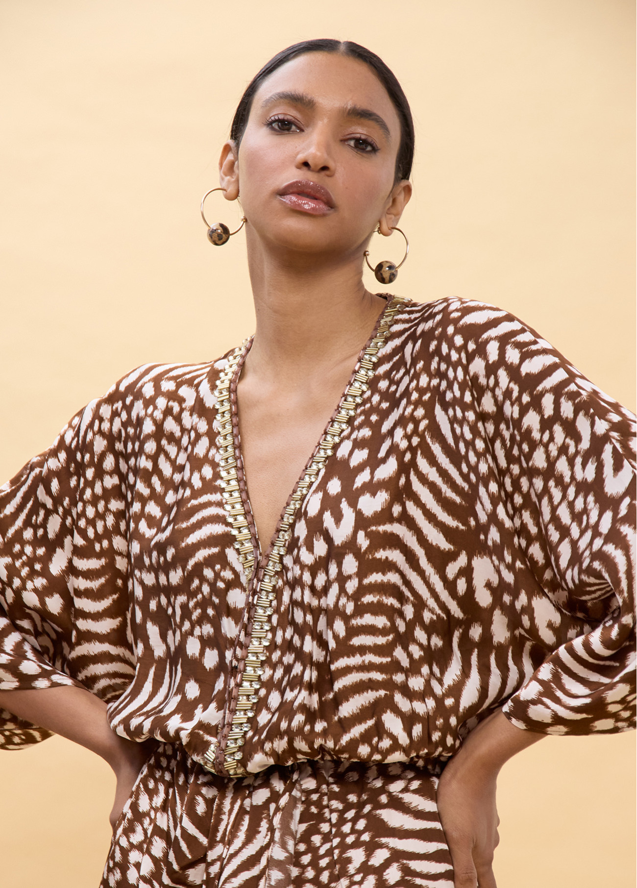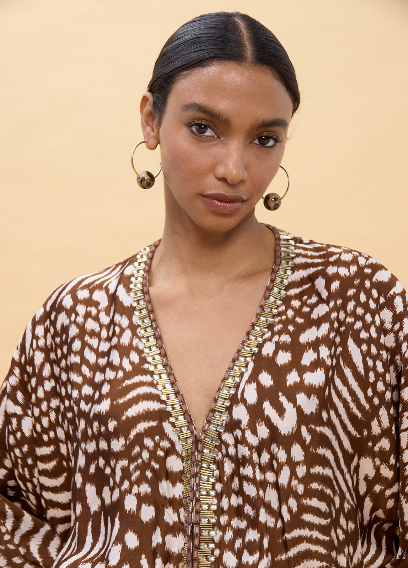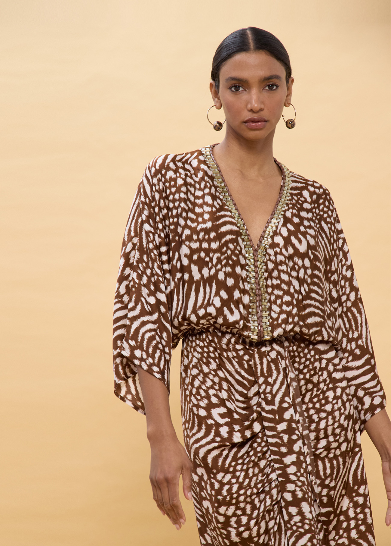Abito lungo con stampa macchie in tonalità terre. Maniche ampie che danno fluidità al design. Scollo a V con dettaglio ricamato lungo il bordo. Vita aderente per valorizzare la silhouette. Perfetto per uno stile estivo elegante.