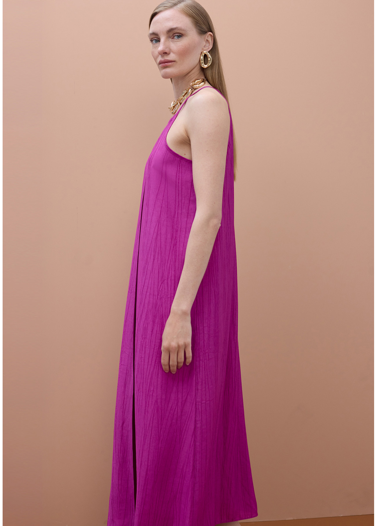Abito lungo e fluente con spalline sottili e scollo dritto, ideale per l'estate. Realizzato in un tessuto leggero che offre movimento e freschezza. Disponibile in una vibrante tonalità fucsia che risalta in ogni evento.