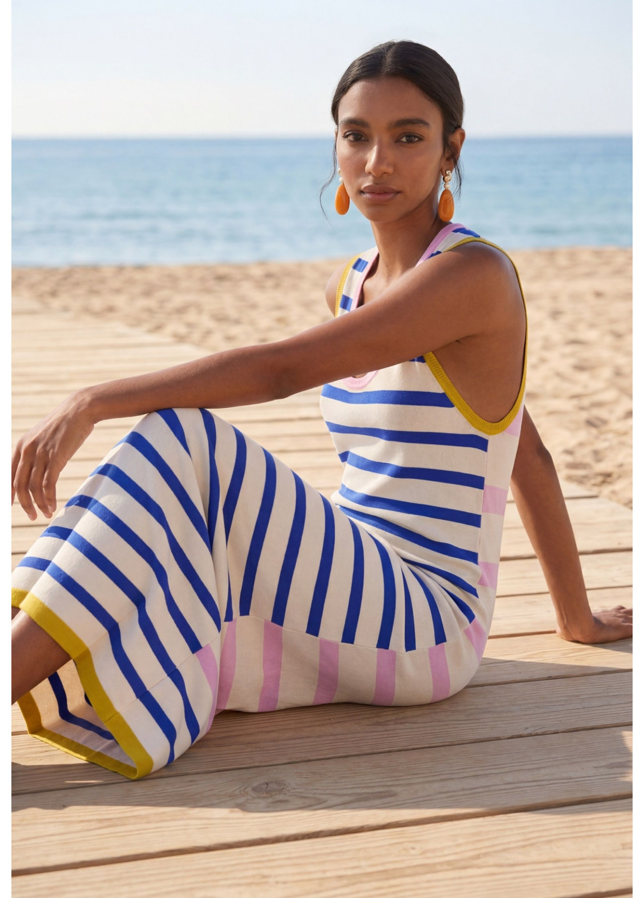 Abito a Maglia a Righe Tricolore con Bordo a Contrasto