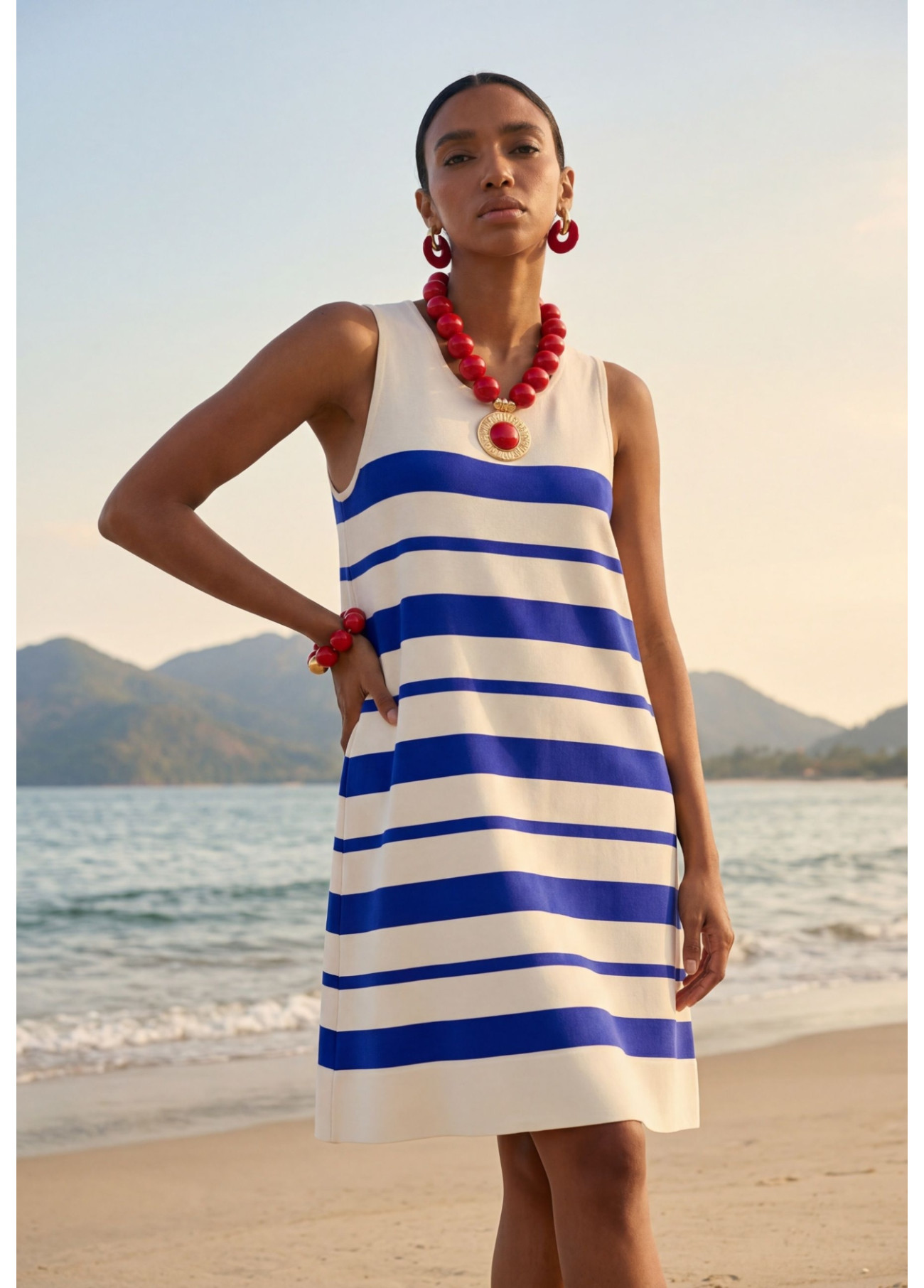 Vestito corto in maglia con spalle larghe e design svasato. Presenta righe irregolari blu e bianche per un tocco moderno. Ideale per un look fresco e casual. Realizzato in tessuto morbido e confortevole. Perfetto per le giornate estive.