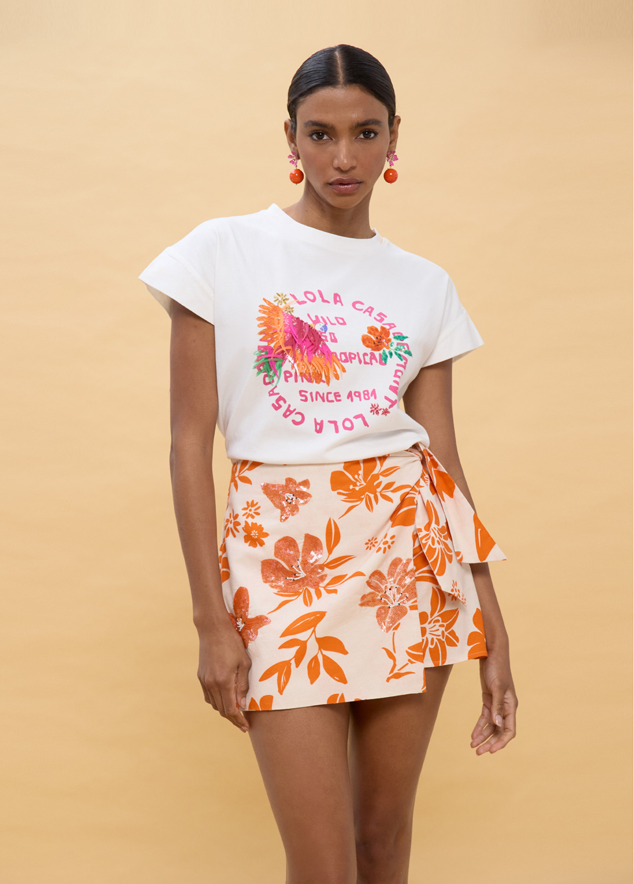 Gonna-pantalone corta con un elegante stampa di palme. Realizzata in tessuto leggero, perfetta per le giornate calde. Chiusura laterale con fiocco decorativo che aggiunge un tocco femminile e fresco. Perfetta da abbinare a T-shirt basi e sandali.