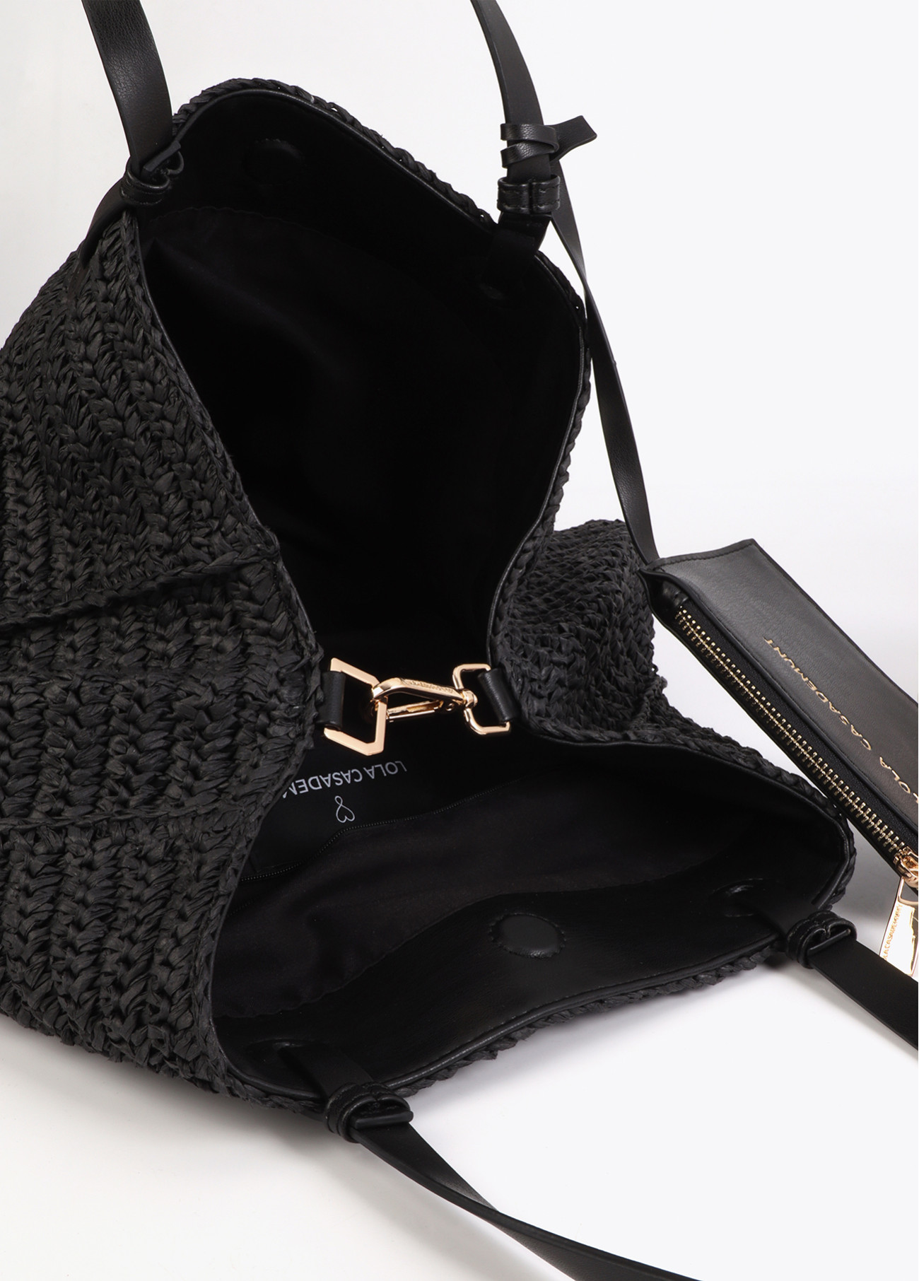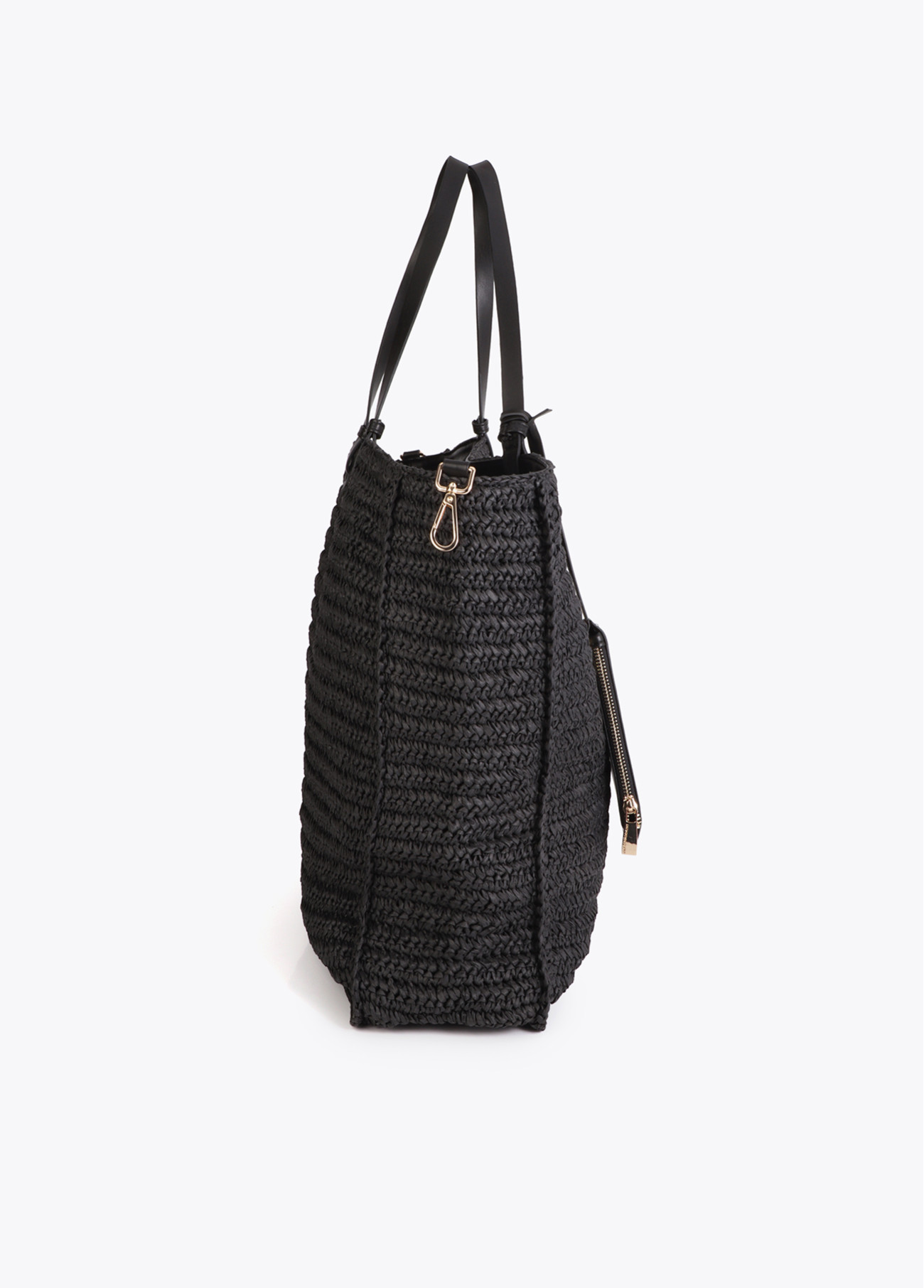 Borsa moderna in rafia nera con design destrutturato. Manici in pelle sintetica e dettagli in paillettes dorate con logo 'Summer Club'. Perfetta per un look estivo casual. Chiusura magnetica e interno spazioso per tutto il necessario.