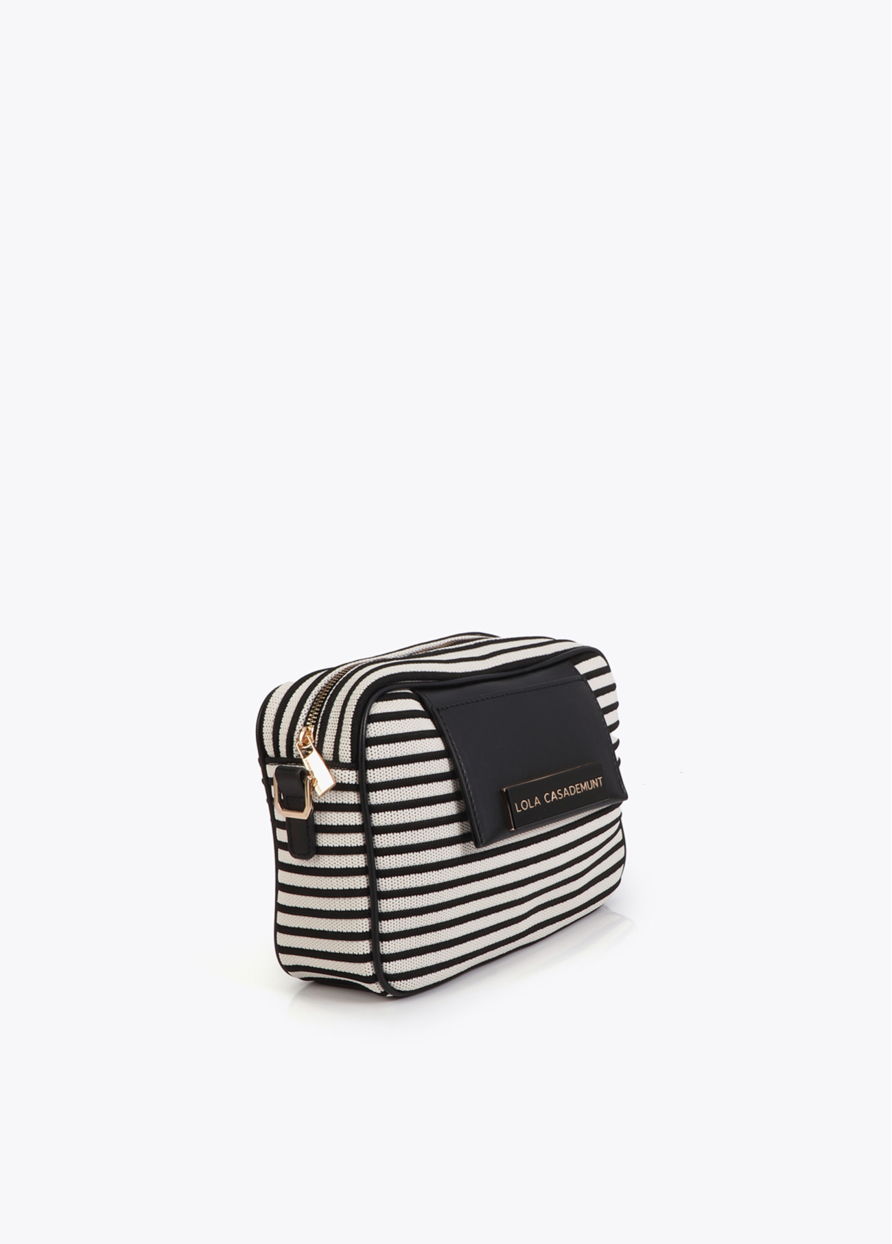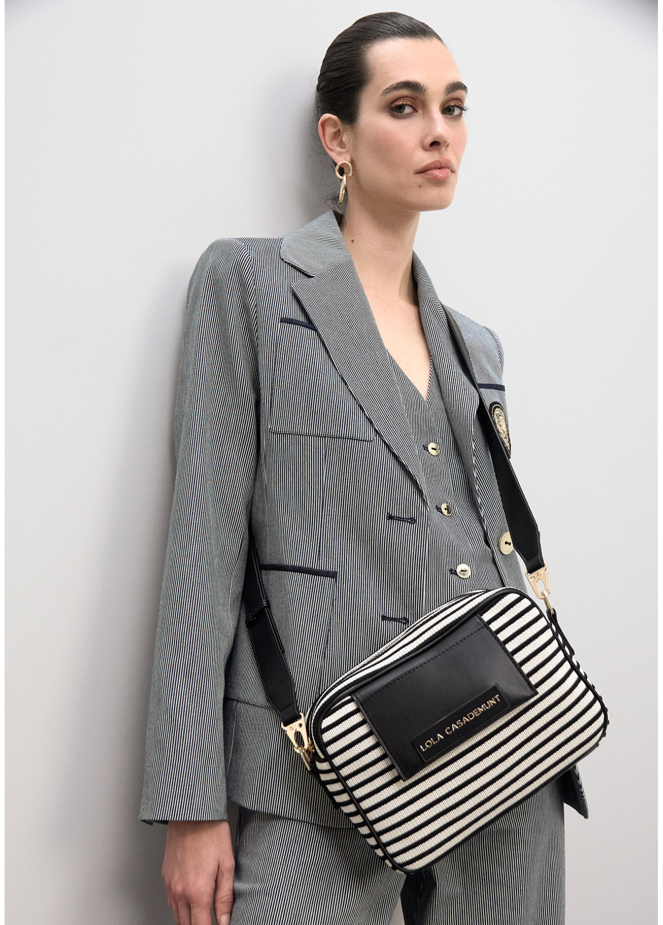 Borsa a tracolla a righe con dettagli in effetto pelle. Chiusura con zip dorata e tracolla regolabile. Presenta una placca con logo sul davanti, unendo stile e funzionalità per l'uso quotidiano.