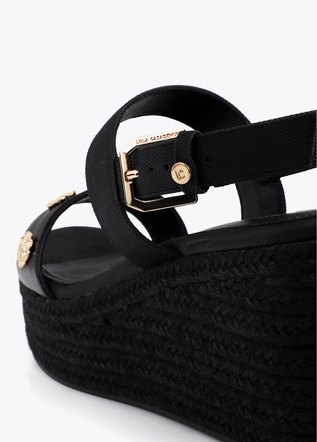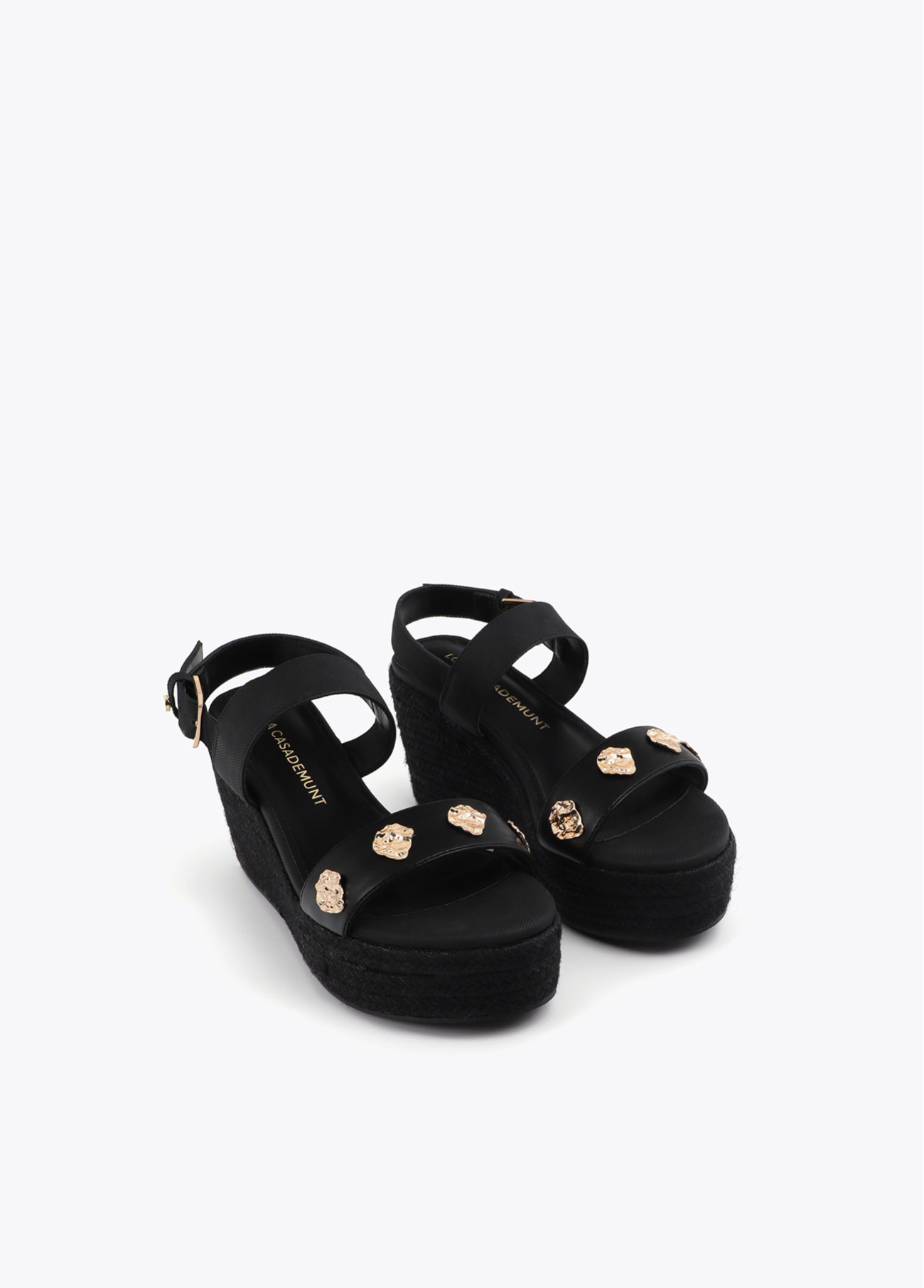 Sandali con zeppa in tessuto effetto rafia metallizzato. Design con fasce e dettagli decorativi dorati. Chiusura regolabile con fibbia e piattaforma comoda per uno stile quotidiano.