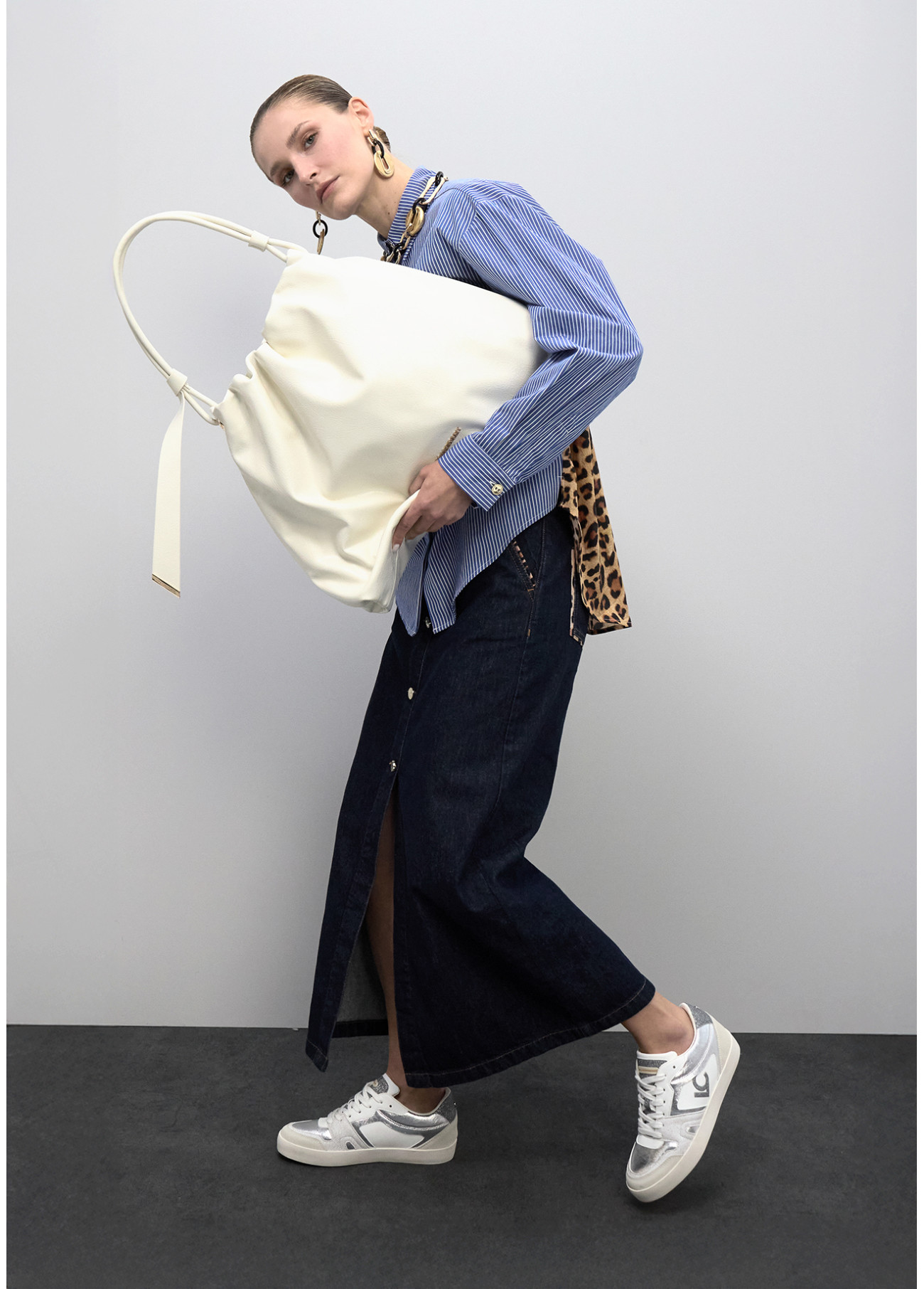 Elegante shopper branca com detalhe de laço e logotipo dourado. Feita em couro sintético de alta qualidade. Inclui fecho magnético e interior espaçoso, perfeito para o uso diário.
