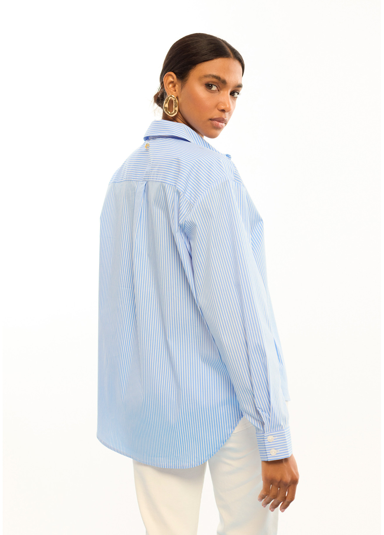 Camisa de popeline listrada adornada com flores delicadas nos ombros. Desenhada com um corte fluido para um estilo feminino e elegante. Apresenta gola clássica e fecho de botões oculto.