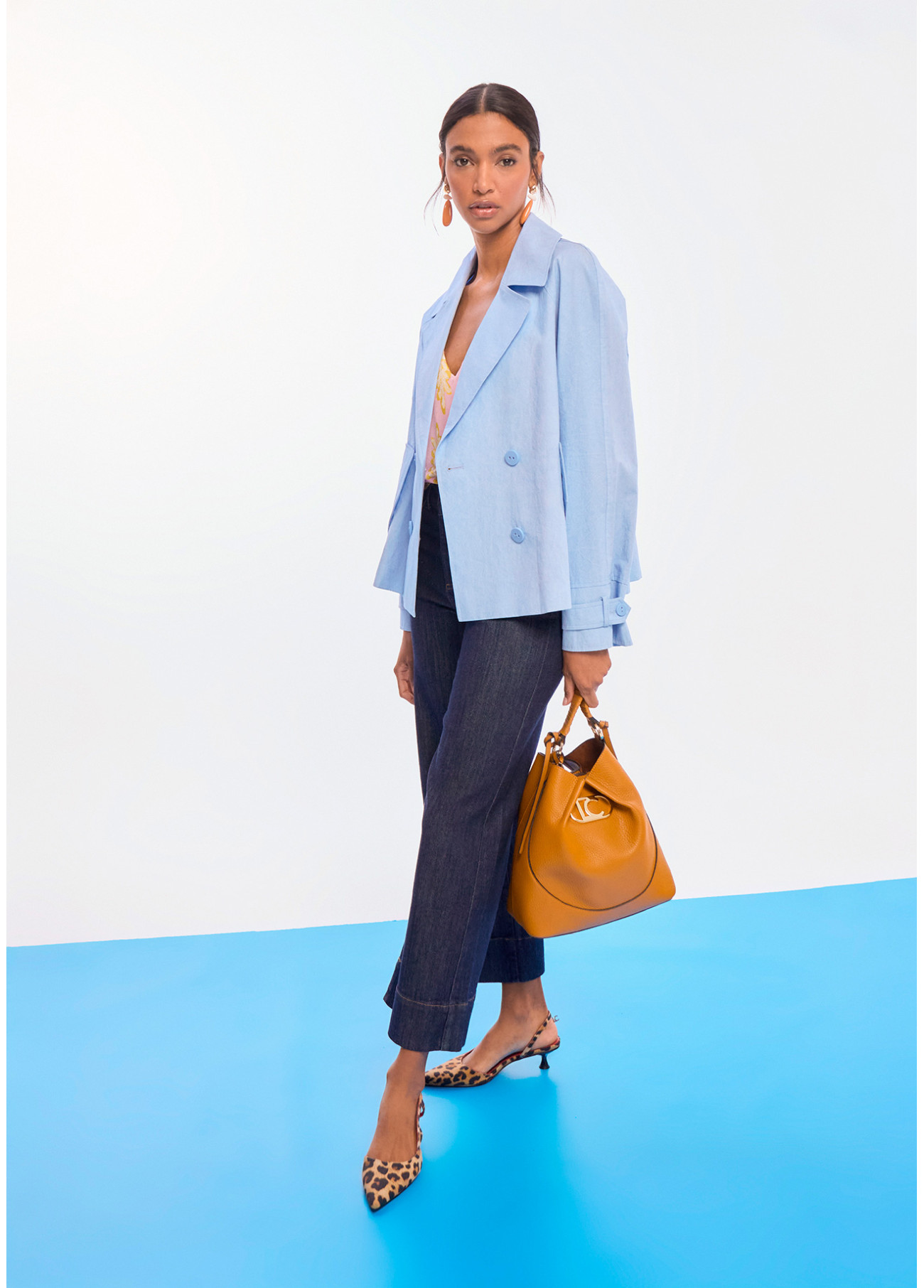 Casaco cruzado de estilo contemporâneo em suave tecido delavé azul. Design elegante com fecho de botões, colarinho largo e mangas compridas ajustáveis. Ideal para adicionar um toque sofisticado a qualquer conjunto diário.