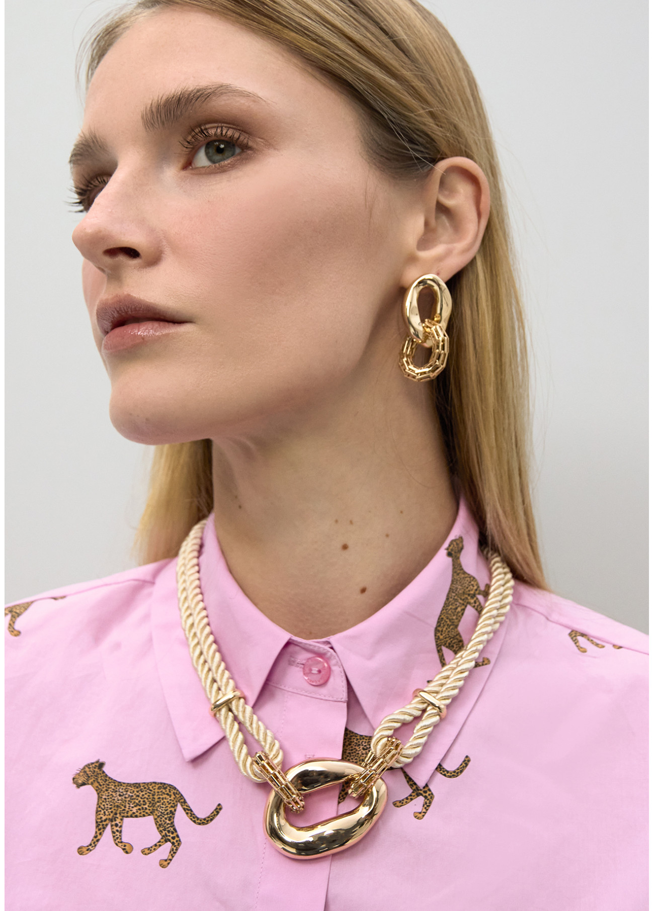 Colar exclusivo com design elegante, cordão texturizado e elos metálicos dourados. Perfeito para adicionar um toque refinado a qualquer look. Fecho ajustável para maior comodidade.