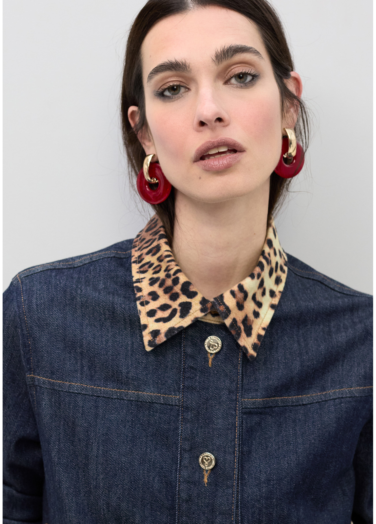 Jaqueta curta de denim com detalhes em colarinho e aba de leopardo