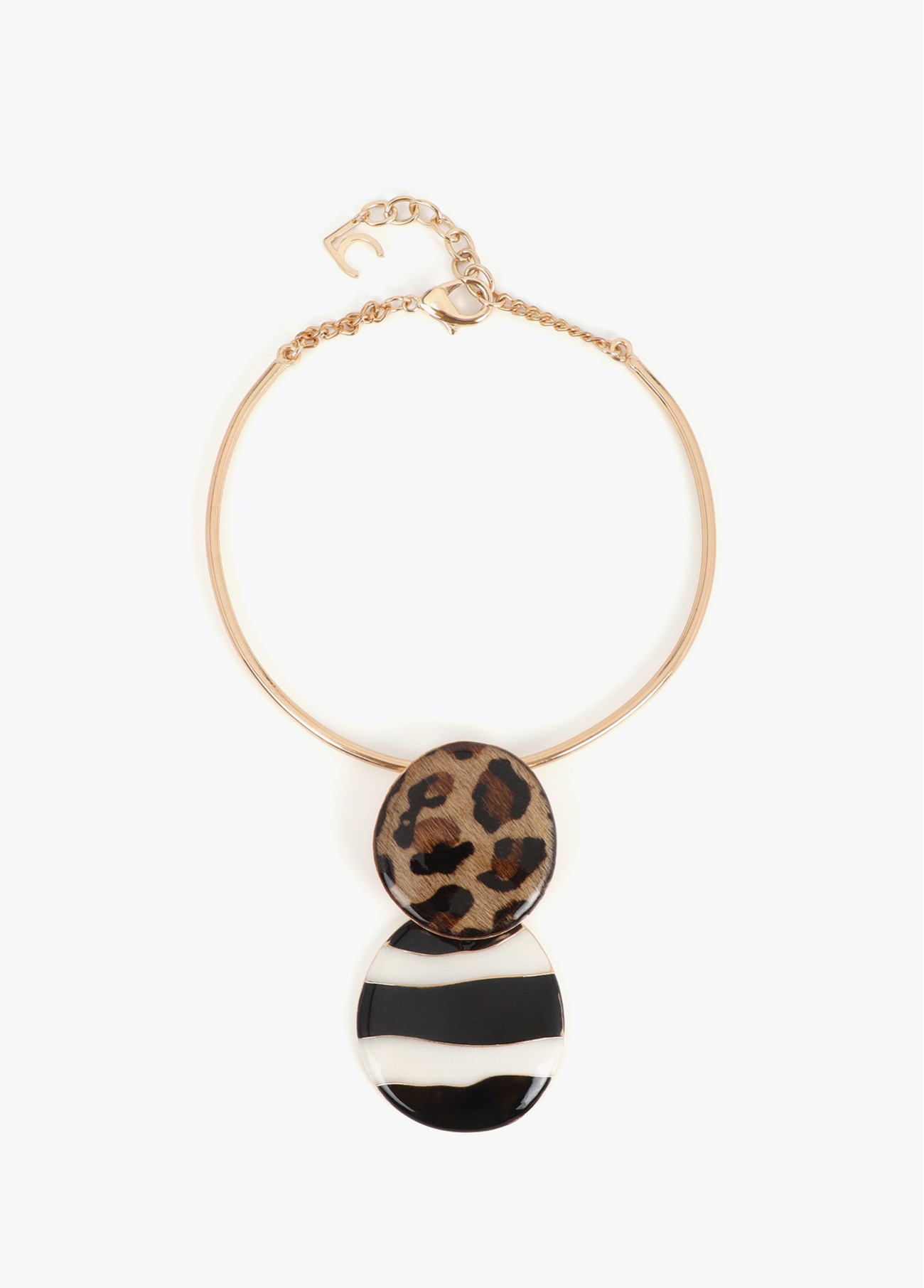 Colar curto gargantilha rígida com pingente combinado animal print e listras