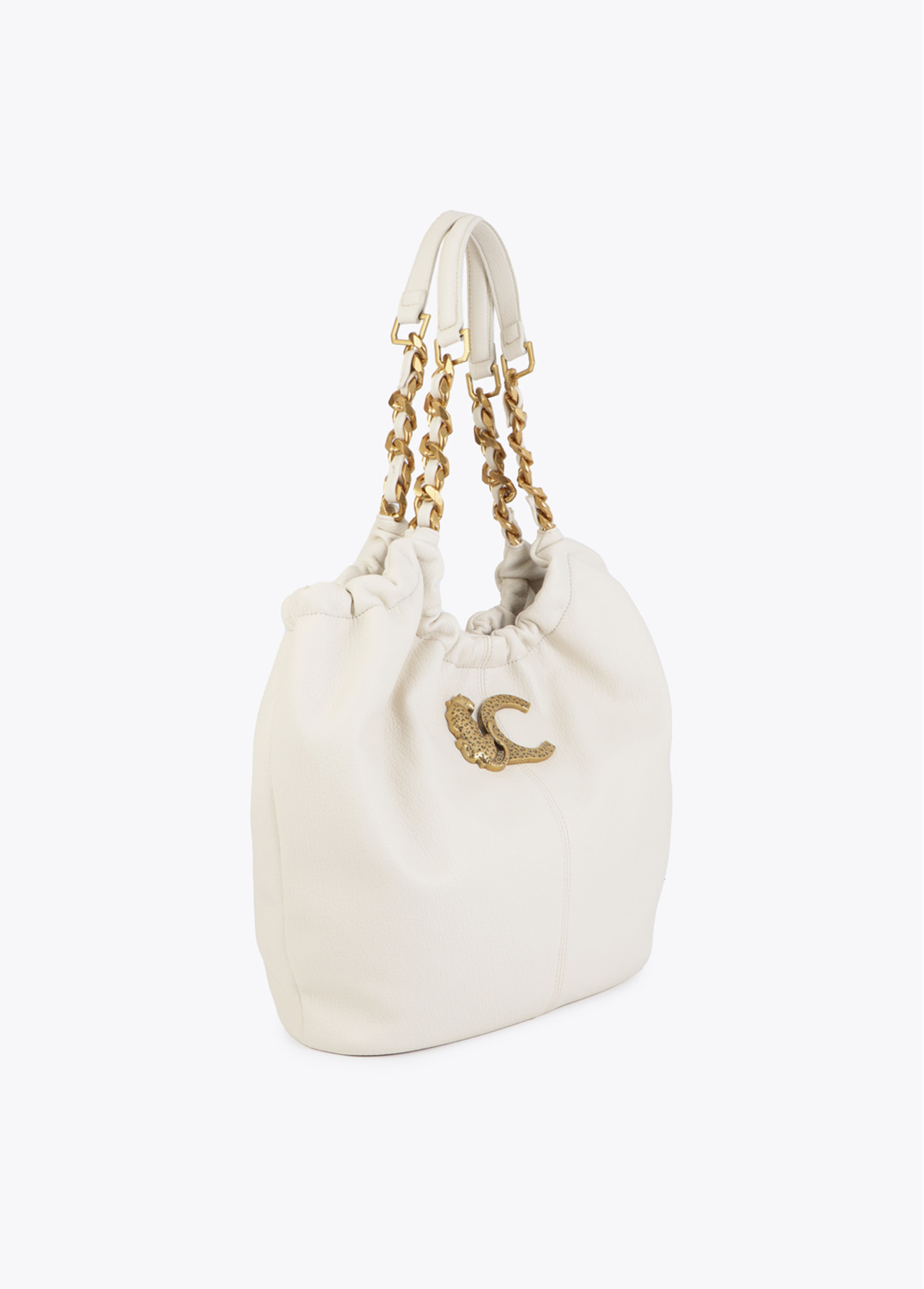 Elegante bolsa shopper em tom claro com detalhe de corrente dourada. Decorado com emblema animal na frente. Interior espaçoso com bolsos. Perfeito para o uso diário.
