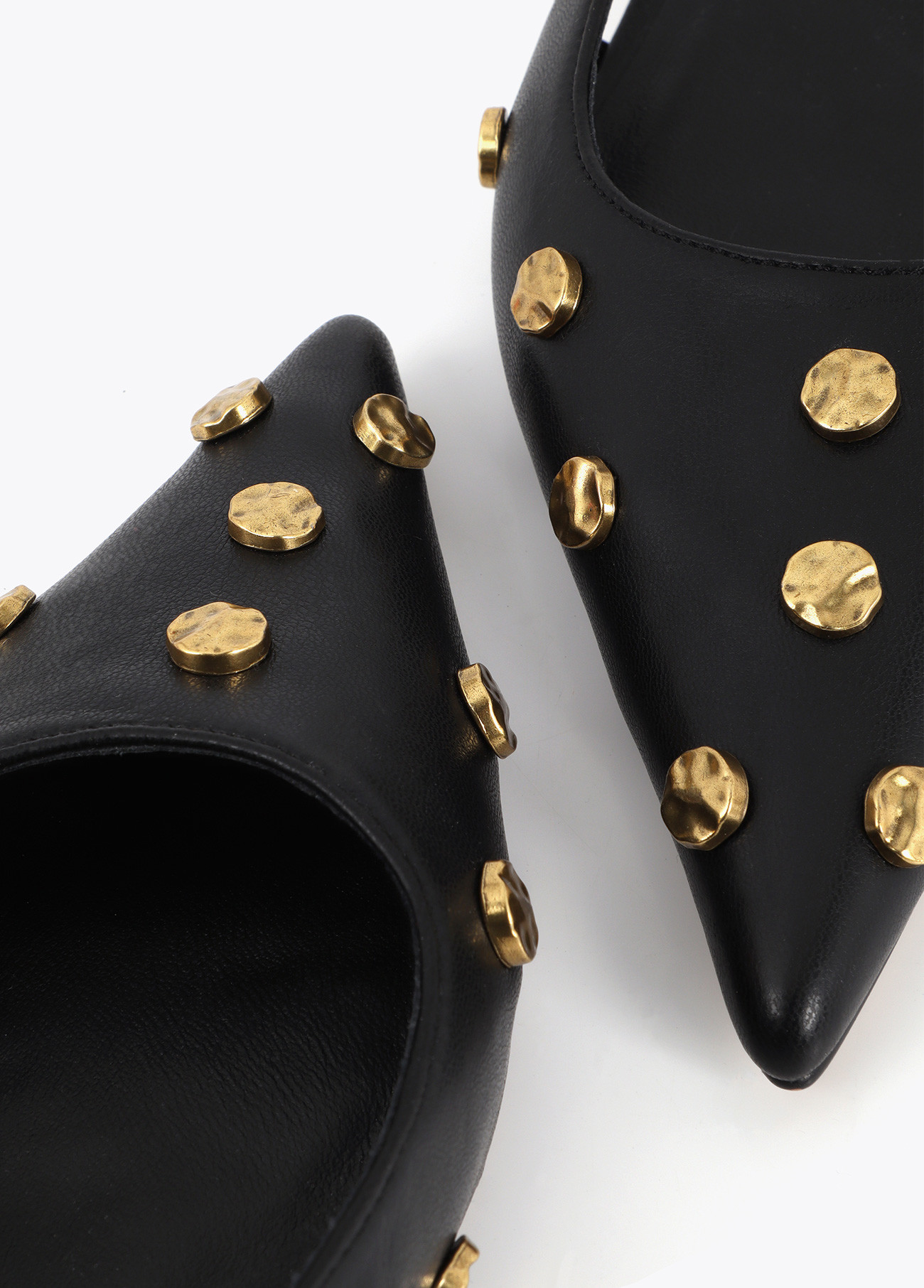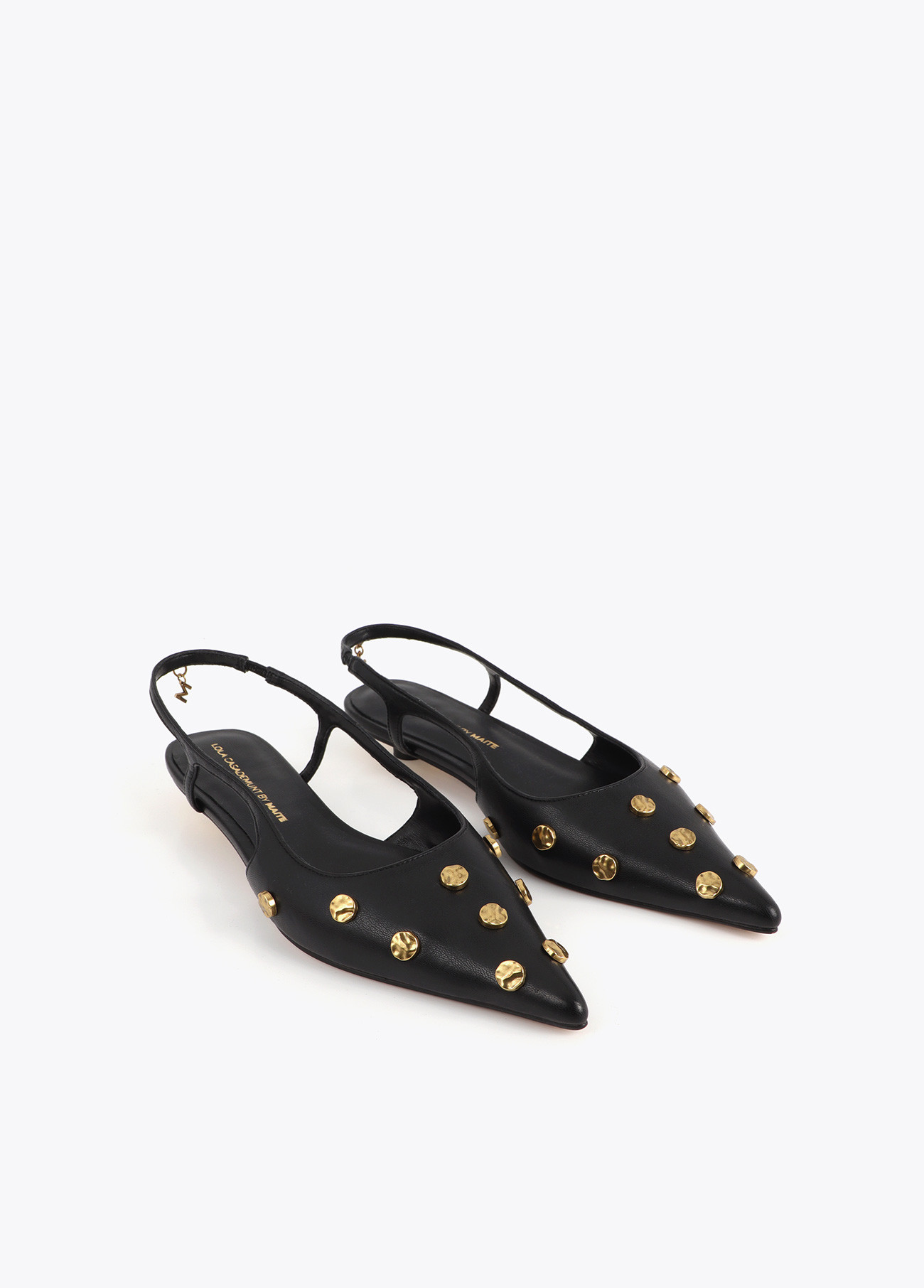 Sapatos elegantes de salto baixo com design pontiagudo e tachas douradas. Feitos de couro de alta qualidade com fecho traseiro ajustável. Ideais para adicionar um toque sofisticado ao seu estilo diário. Confortáveis e versáteis para qualquer ocasião.