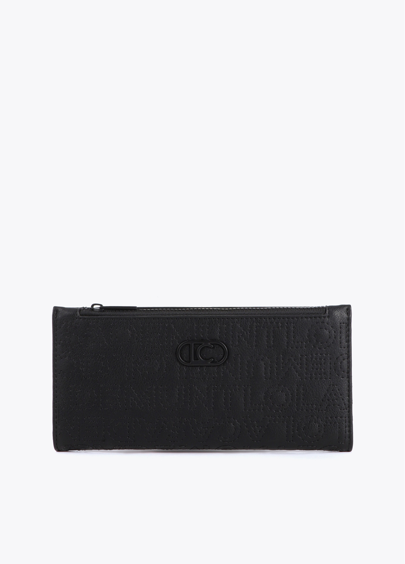 Elegante carteira em material sintético com pespontos formando o logotipo. Compartimentos internos para cartões e fecho de zíper. Um acessório sofisticado com acabamento preto, ideal para aqueles que buscam funcionalidade e elegância.