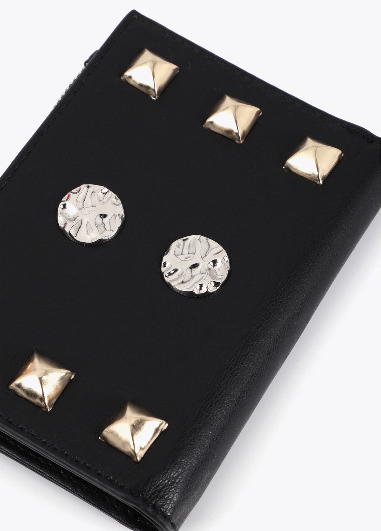 Carteira elegante com fecho seguro e detalhes de tachas em tons de ouro e prata. Compartimentos internos para cartões e notas. Acabamento em couro sintético de alta qualidade.