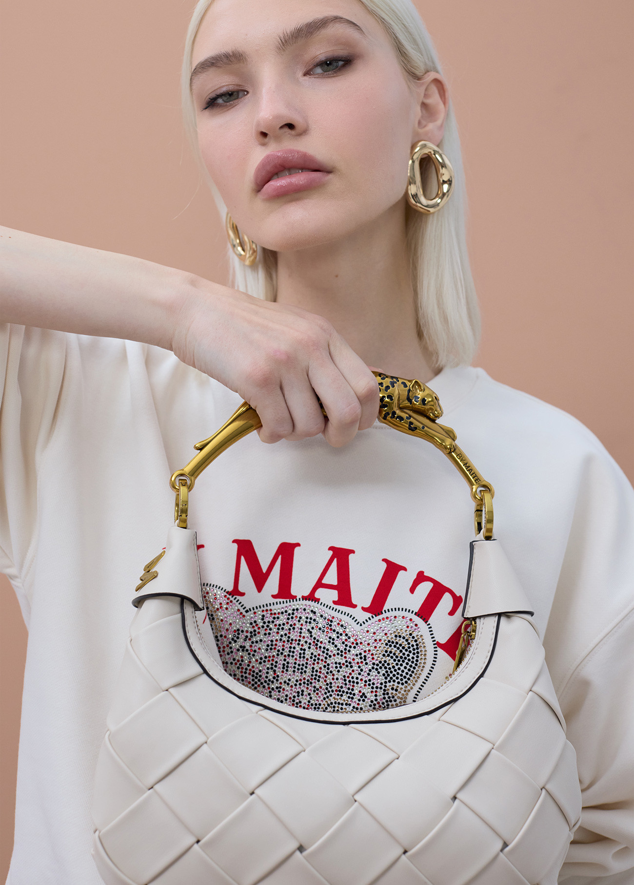 Bolsa em meia-lua com acabamentos trançados em tom neutro. Alça de metal em forma de leopardo dourado, ideal para um look sofisticado. Fecho de zíper e logotipo metálico decorativo.