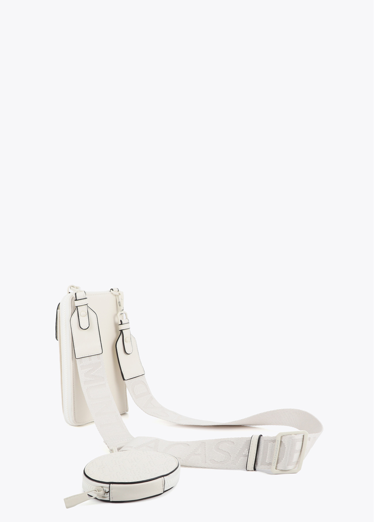 Bolsa para celular em tom marfim elegante com design de costura de logo. Inclui alça ajustável para conveniência. Mantenha seu dispositivo seguro e acessível a qualquer momento. Material durável.