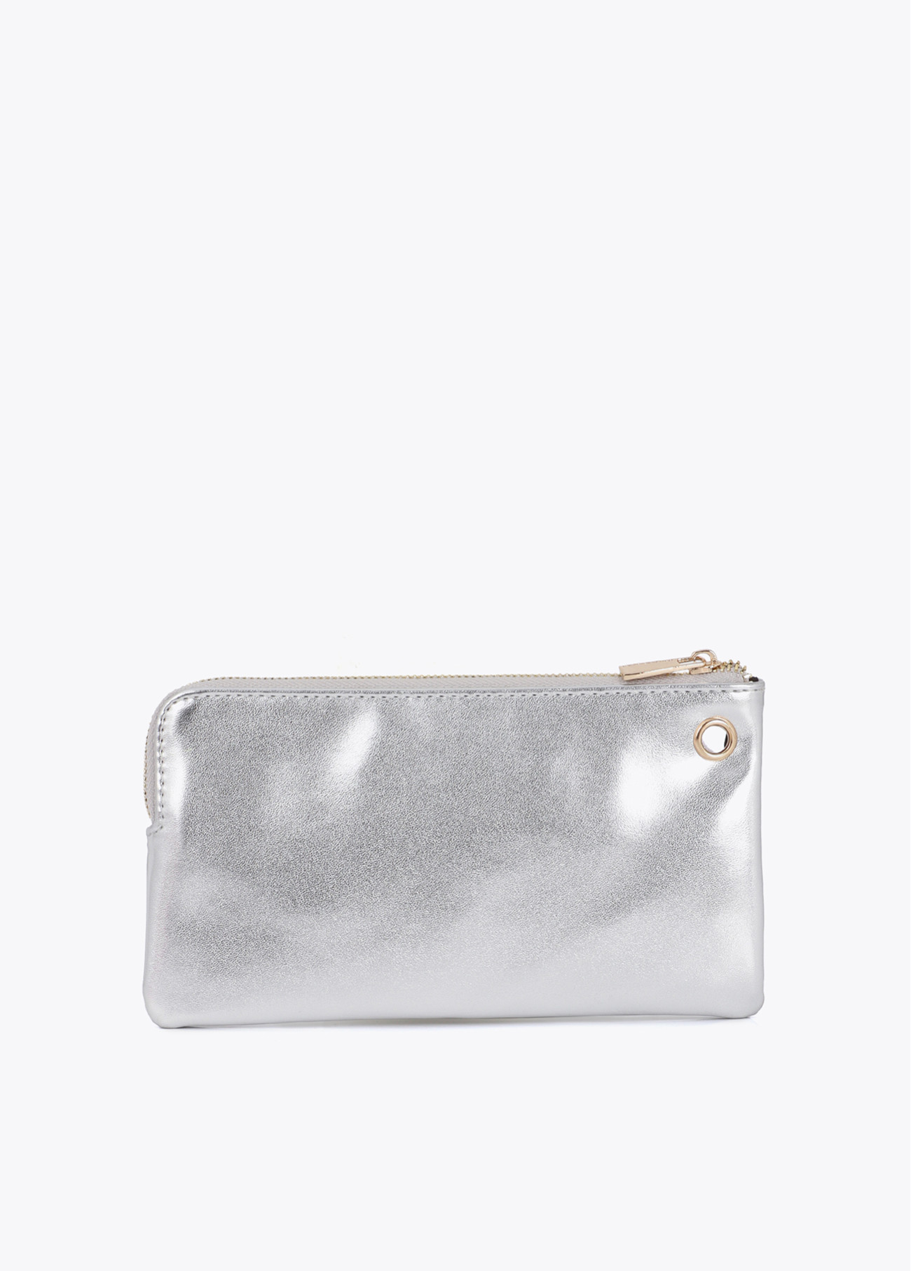 Carteira dupla elegante em tons metálicos, prata e dourado. Inclui pendente LC prático. Feita de material sintético de alta qualidade, ideal para uso diário com fecho de zíper seguro.