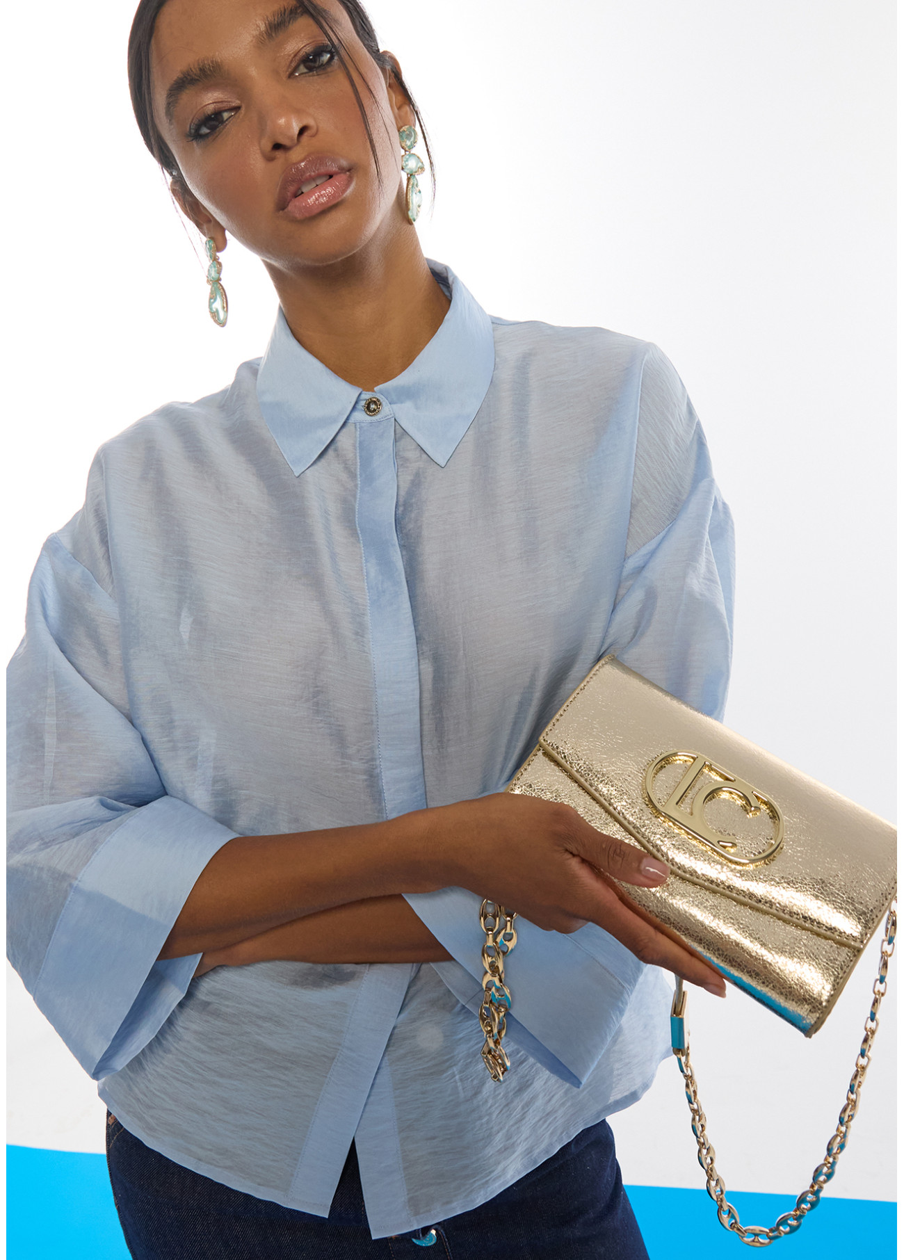 Elegante bolsa tiracolo metalizada com corrente dourada e fecho magnético. Perfeita para completar seu look de festa. Detalhe do logotipo Lola Casademunt na alça ajustável.