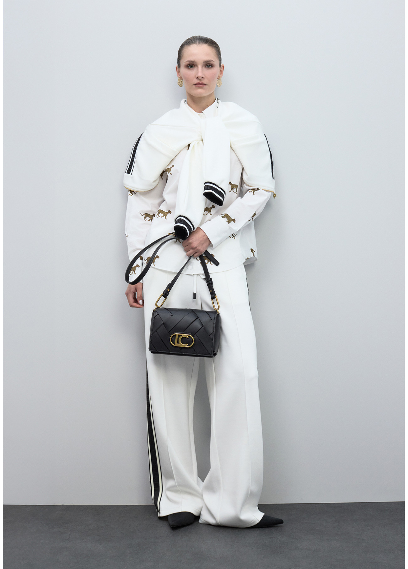 Bolsa transversal trançada sofisticada com detalhe dourado na frente. Confeccionada com materiais de alta qualidade, possui fecho magnético de aba e alça ajustável. Perfeita para usar durante o dia ou à noite, acrescentando um toque elegante a qualquer look.