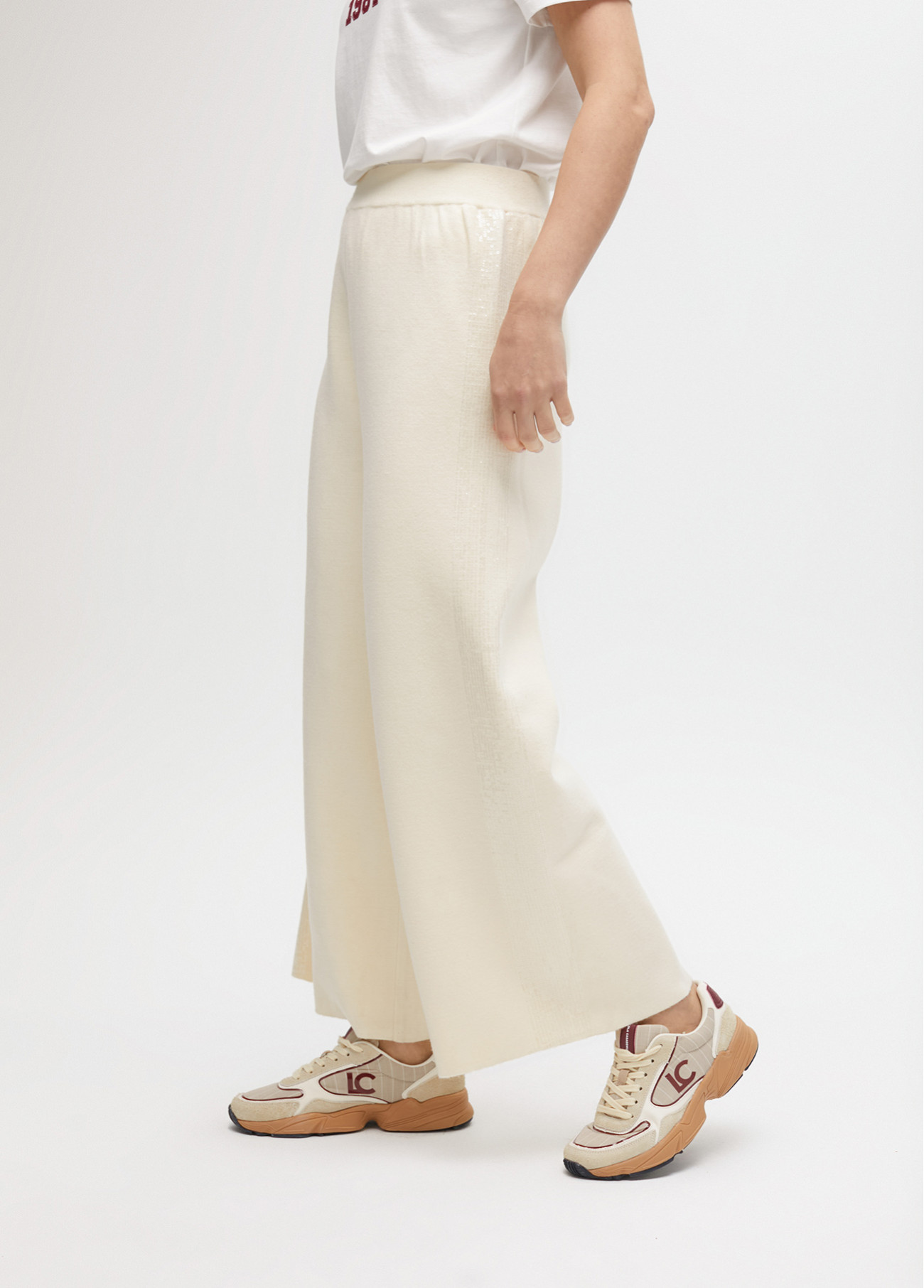 Calças de malha com corte solto e detalhes de lantejoulas laterais. Cintura elástica para maior conforto. Combina perfeitamente com looks casuais e elegantes.