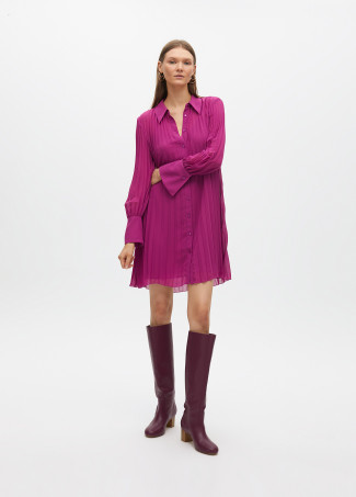 Vestido curto com pregas delicadas em tecido leve. Apresenta colarinho de camisa e mangas longas com punhos. Fecho de botão frontal completo para um ajuste elegante. Perfeito para um visual sofisticado e moderno.