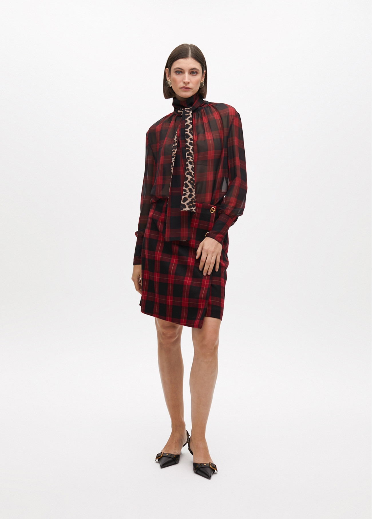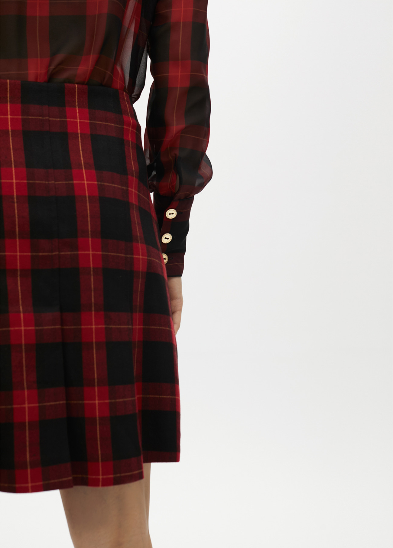 Mini saia xadrez tartan, tons vermelhos e pretos. Feita em lã para um inverno quente. Fecho lateral com botões dourados decorativos. Ajuste na cintura que realça a figura, um essencial para a estação.