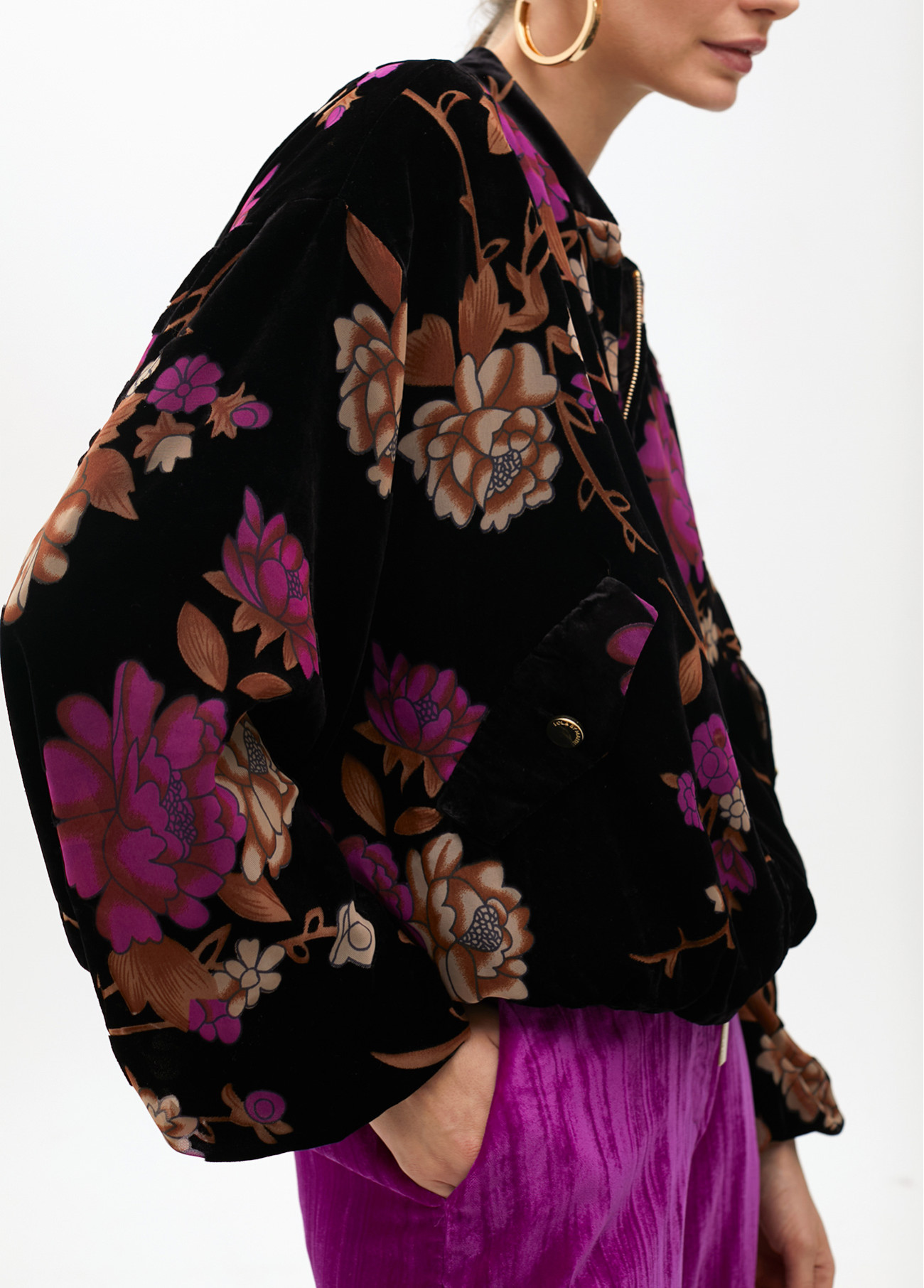 Elegante bomber confeccionada em veludo devoré com uma vibrante estampa floral. Possui fechamento frontal com zíper e bolsos laterais práticos. Ideal para adicionar um toque sofisticado a qualquer look de temporada.