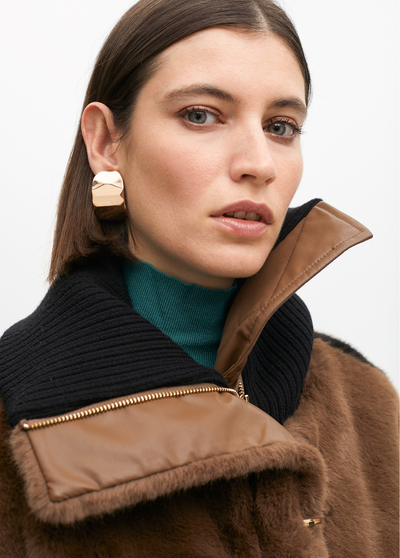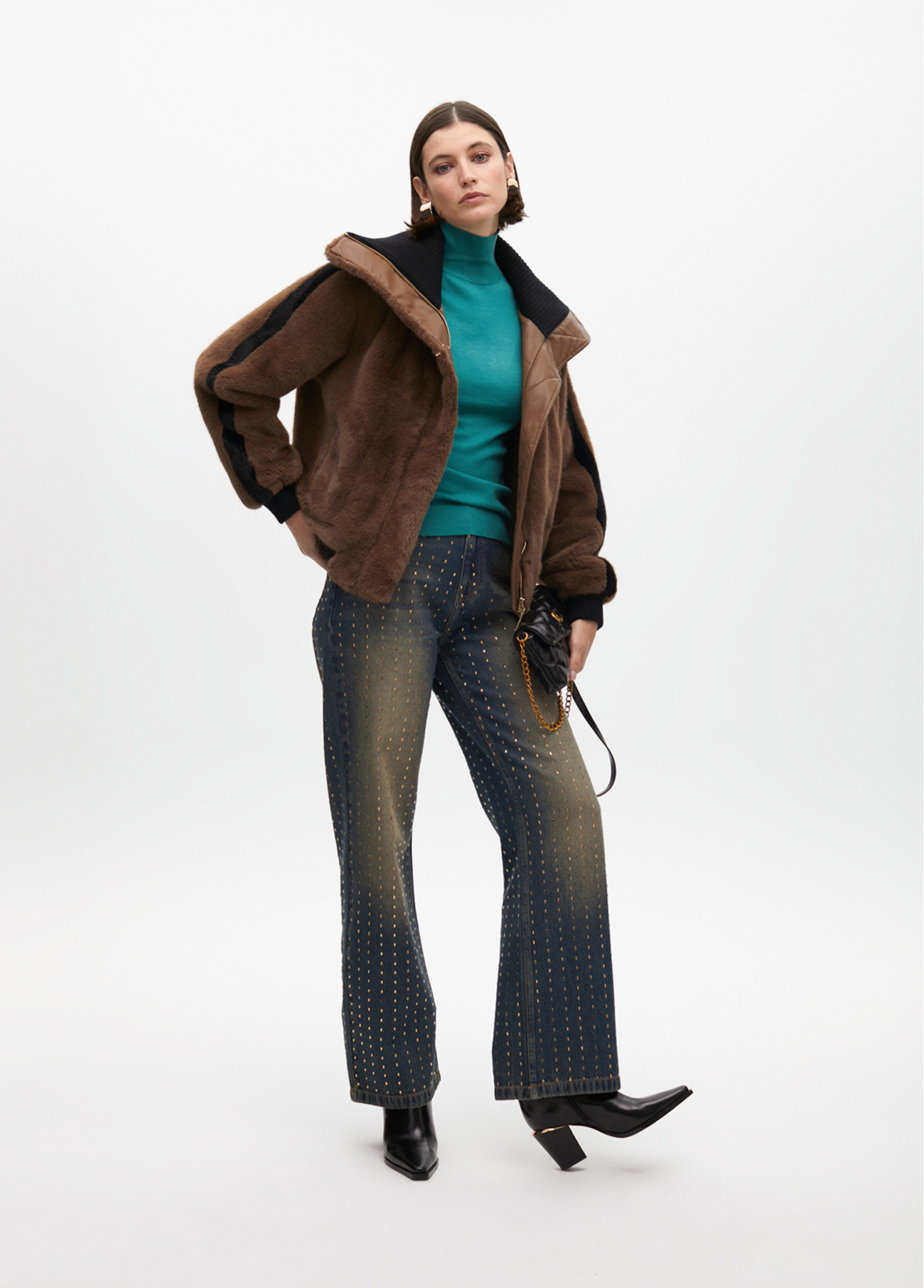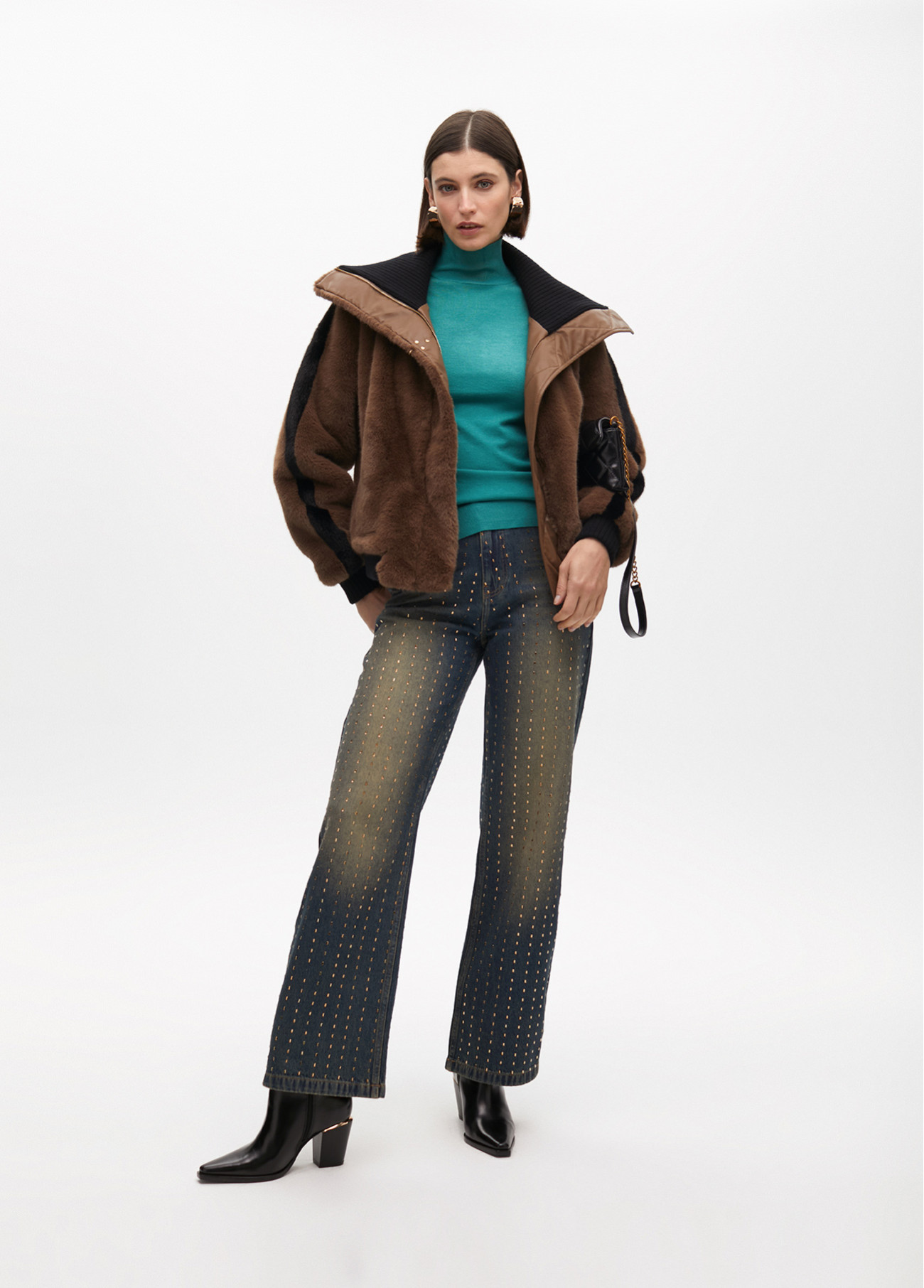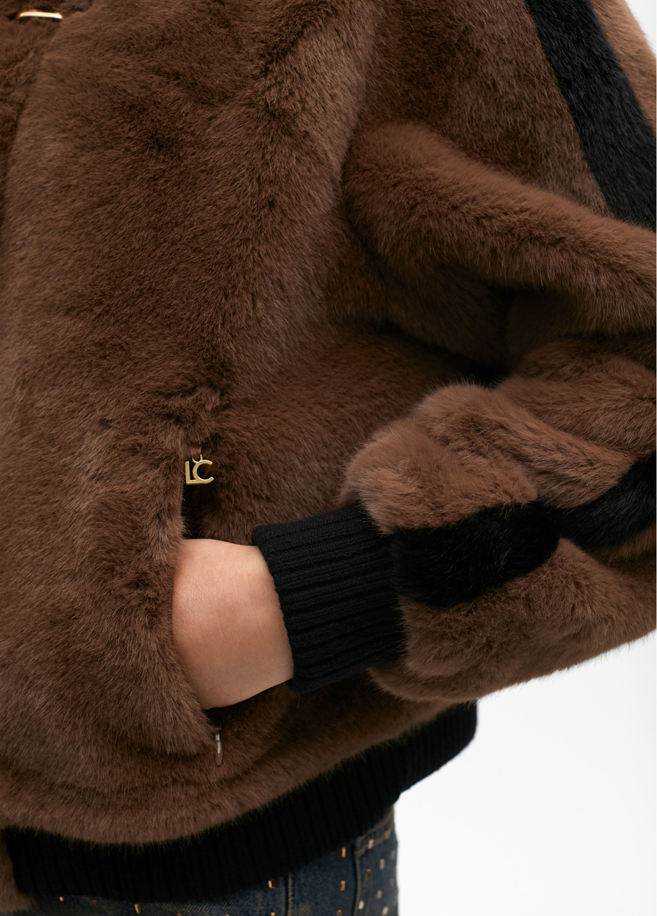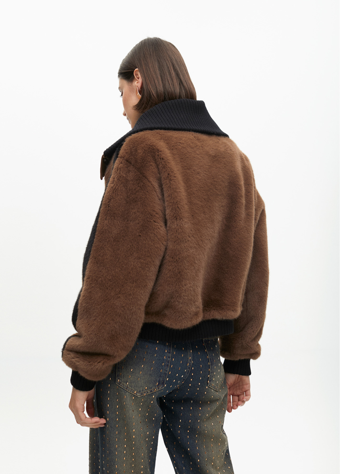 Casaco curto de pele sintética macia com detalhe lateral contrastante. Gola alta e mangas longas. Punhos e bainha ajustados. Design versátil e elegante para diversos estilos.