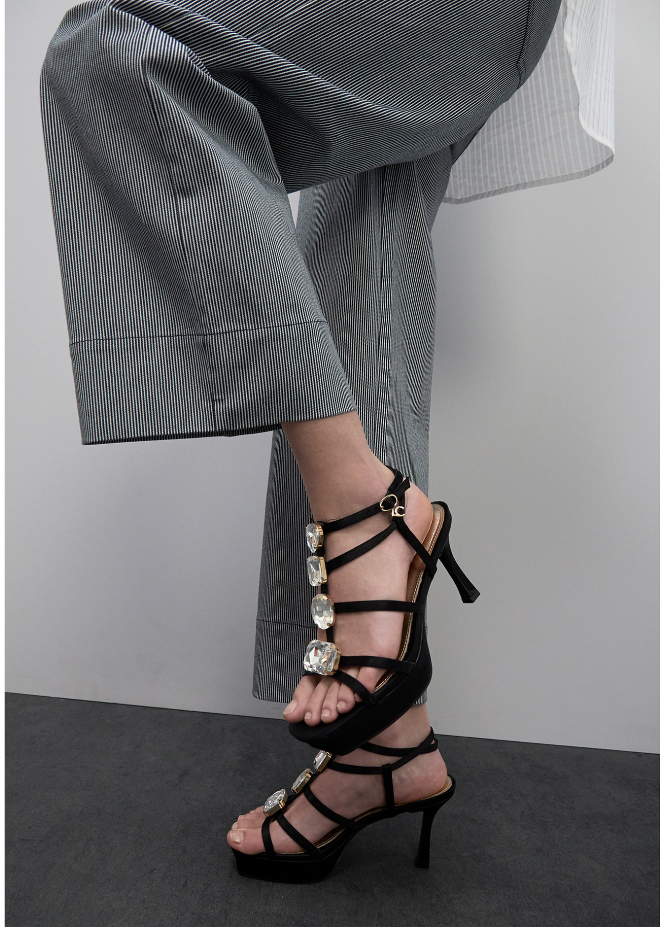 Sapato elegante com salto e tiras adornadas com cristais brilhantes. Design sofisticado em material de seda com fecho ajustável. Salto de altura média polido e sola almofadada para máximo conforto.