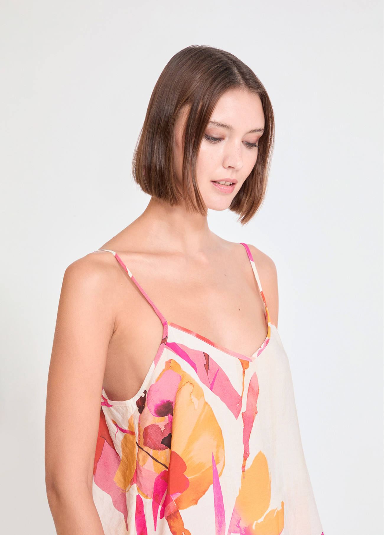 Top lingerie com estampa floral vibrante em tons quentes. Alças finas ajustáveis e corte solto que oferece conforto e estilo. Perfeito para criar um visual fresco e sofisticado nos dias mais quentes. Ideal para combinar com saias ou calças para um toque chique.