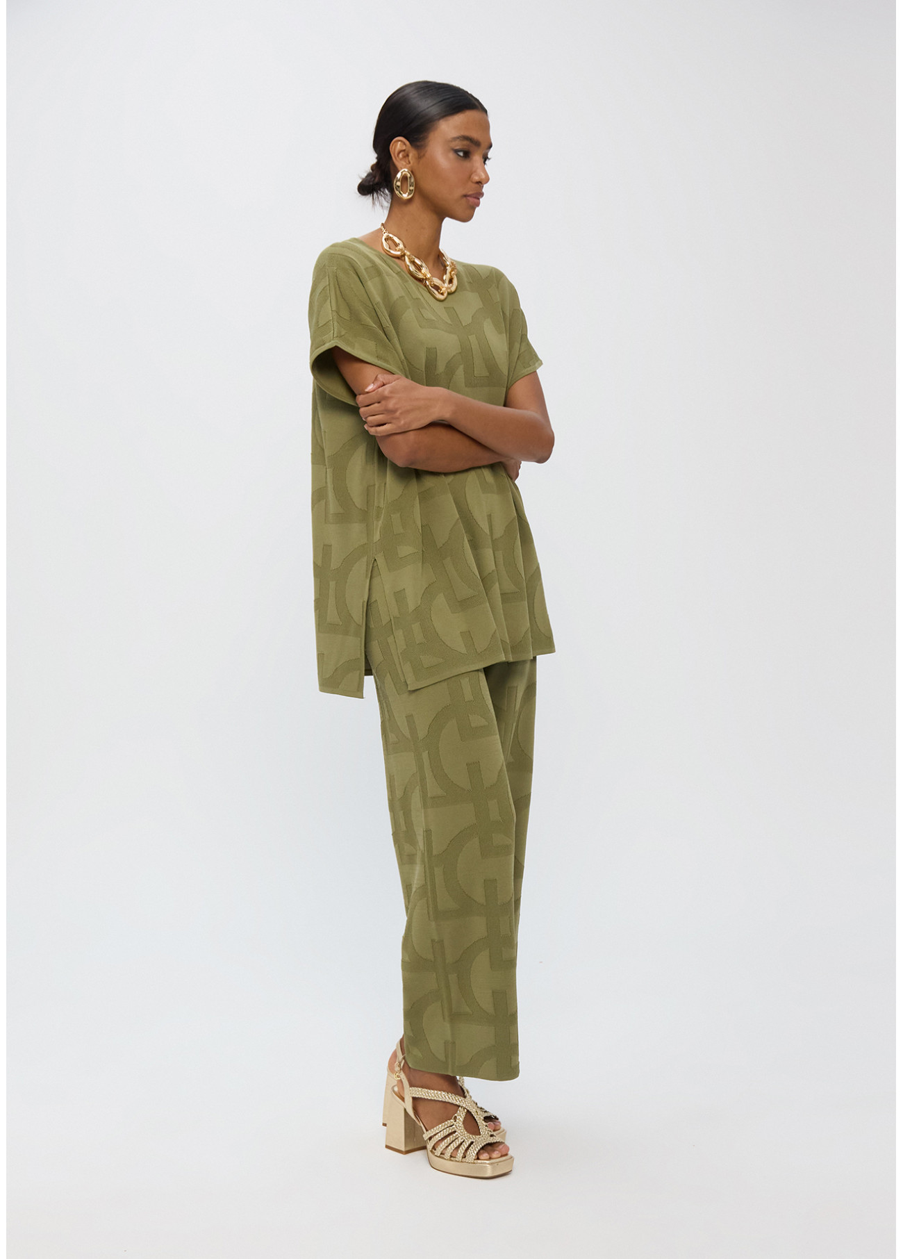 Camiseta de malha com design jacquard verde elegante. Confeccionada em tecido suave e fluido. Apresenta mangas curtas e gola redonda para conforto e estilo diário.