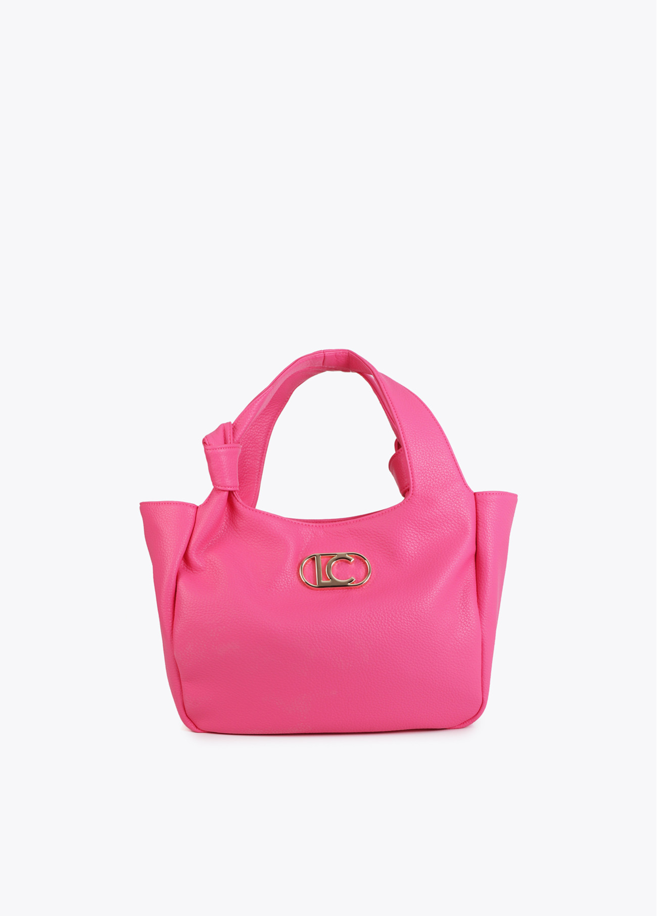 Elegante bolsa shopper rosa com alças amarradas e detalhe de logotipo dourado. Interior espaçoso com fecho de zíper, ideal para um look moderno e elegante.