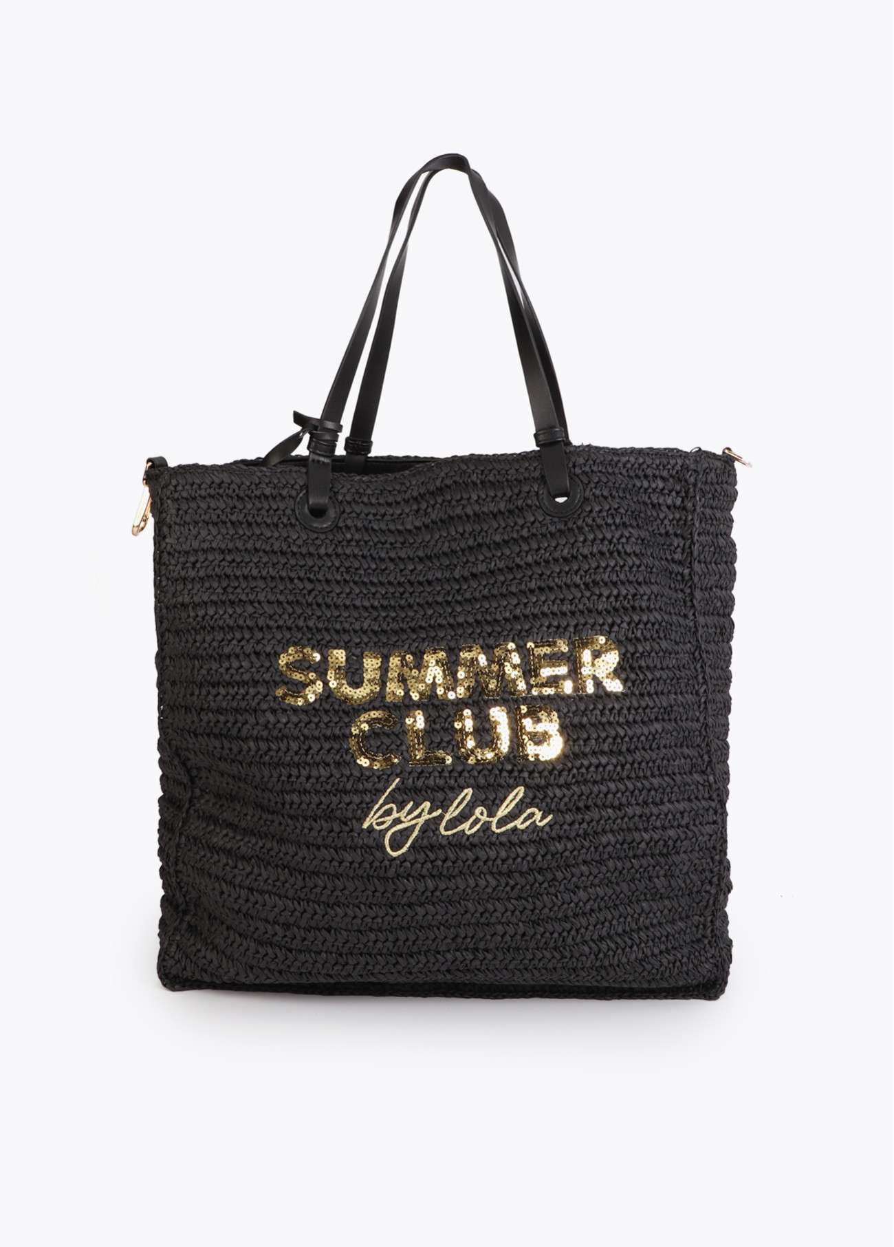 Bolsa moderna em ráfia preta com design desestruturado. Possui alças de couro sintético e detalhes em lantejoulas douradas com logotipo 'Summer Club'. Perfeita para um visual casual de verão. Fechamento magnético e interior espaçoso para todos os essenciais.