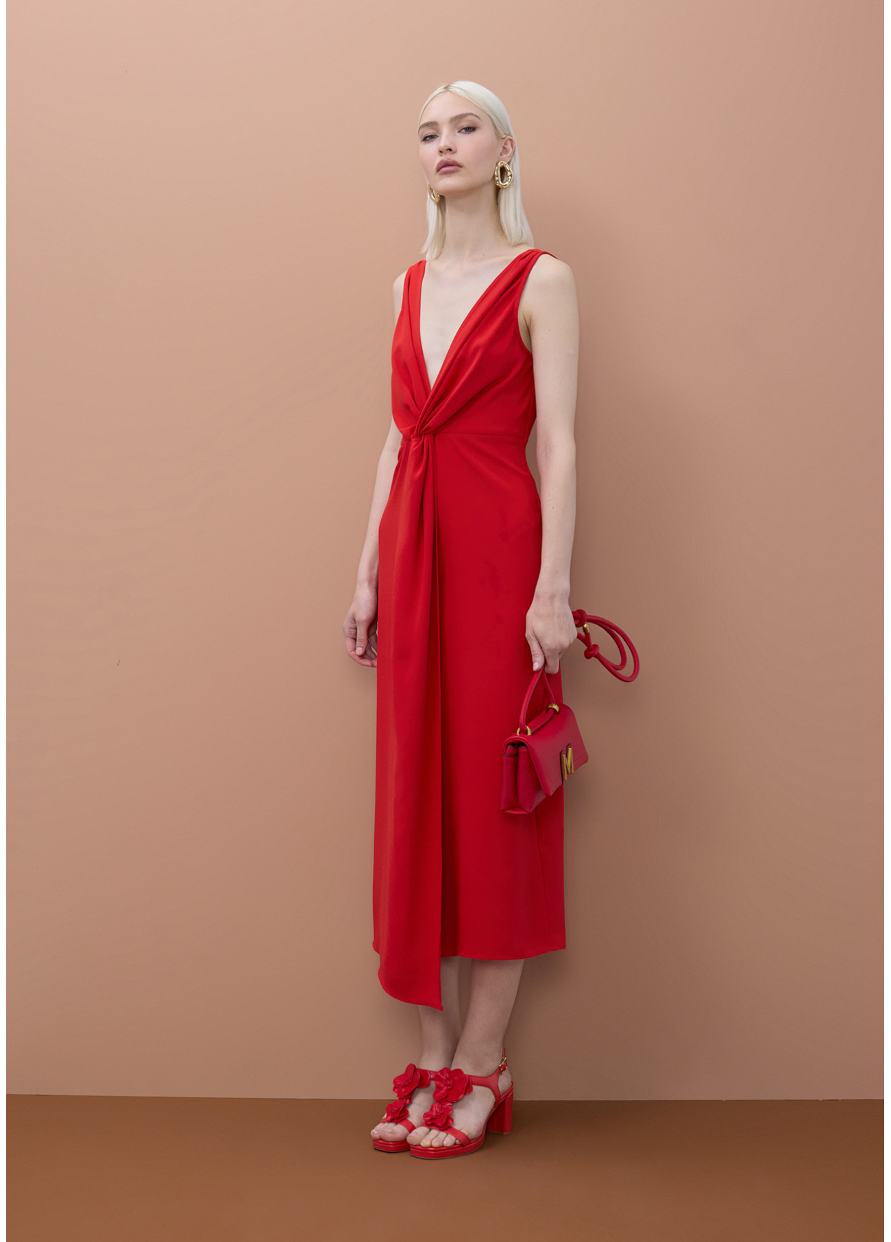 Vestido midi em vermelho vibrante com decote em V profundo, perfeito para um look atraente. O tecido fluido garante conforto e elegância. Design ajustado com detalhe drapeado central, aprimorando uma silhueta sofisticada e feminina. Zíper invisível nas costas para um acabamento impecável.