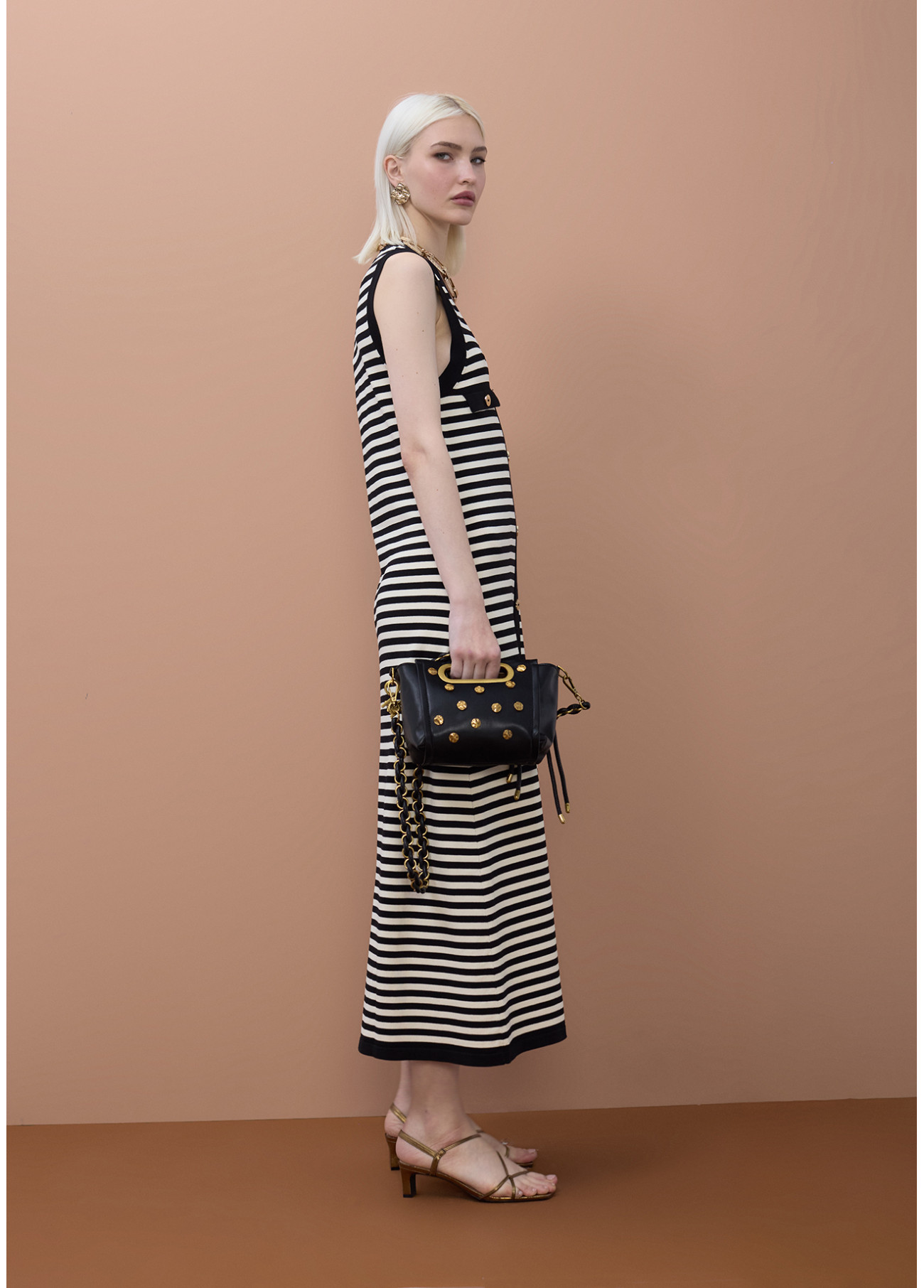 Vestido longo de tricô, sem mangas, com um moderno design listrado em contraste. Apresenta uma elegante abertura frontal e fecho de botões dourados. Perfeito com acessórios chamativos.